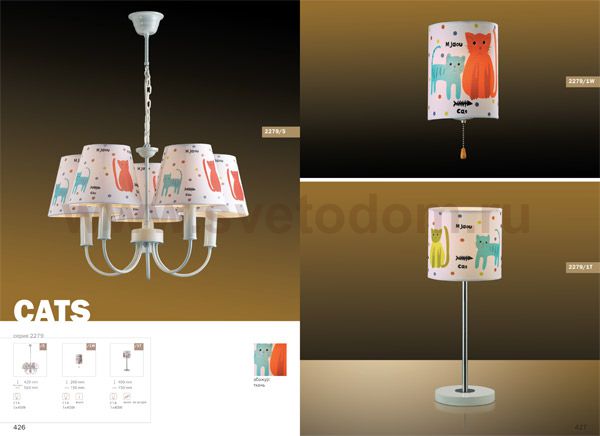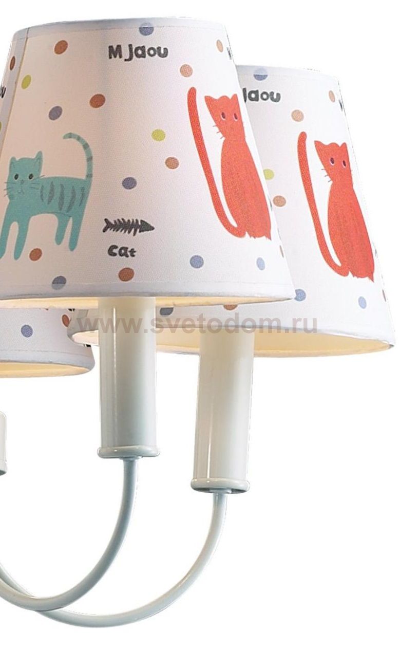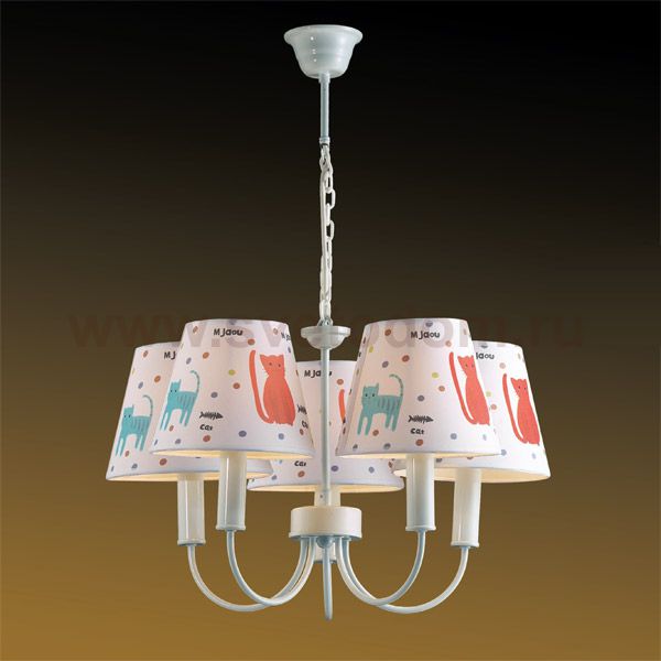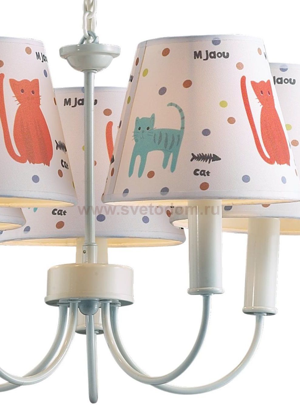 Люстра 2279 / 5 линии Cats выполнена из ярких материалов чистых и насыщенных цветов. Покрытие металлического каркаса белое, позволяет создать благоприятную психологическую атмосферу. Абажуры из ткани дают мягкий и рассеянный свет, что очень важно для развития зрительной системы малышей, а также имеют интересный дизайн в виде милых котят, которые будут развивать позитивное мышление. Цоколь E14. Мощность 5*40W. Нет ламп в комплекте.