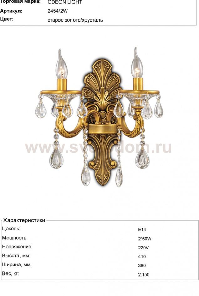 Великолепное бра Odeon light 2454/2W является гордостью целой итальянской коллекции хрустальных светильников. Отдельным преимуществом является возможность использования данного шедевра и вне уже созданного мастерами тандема. Настенное бра Odeon light 2454/2W очень изысканно и уникально! Оно выполнено в форме элегантного канделябра, исполненного в оттенке состаренного золота. Настоящая классика престижа перед Вашими глазами! Безупречный шик и благородство каждой линии принадлежат шедевру света Odeon light 2454/2W. Когда речь идёт о создании дополнительных зон уединения, настенное бра особенно актуально. А благодаря Odeon light 2454/2W Вам просто гарантирована эстетика шика.