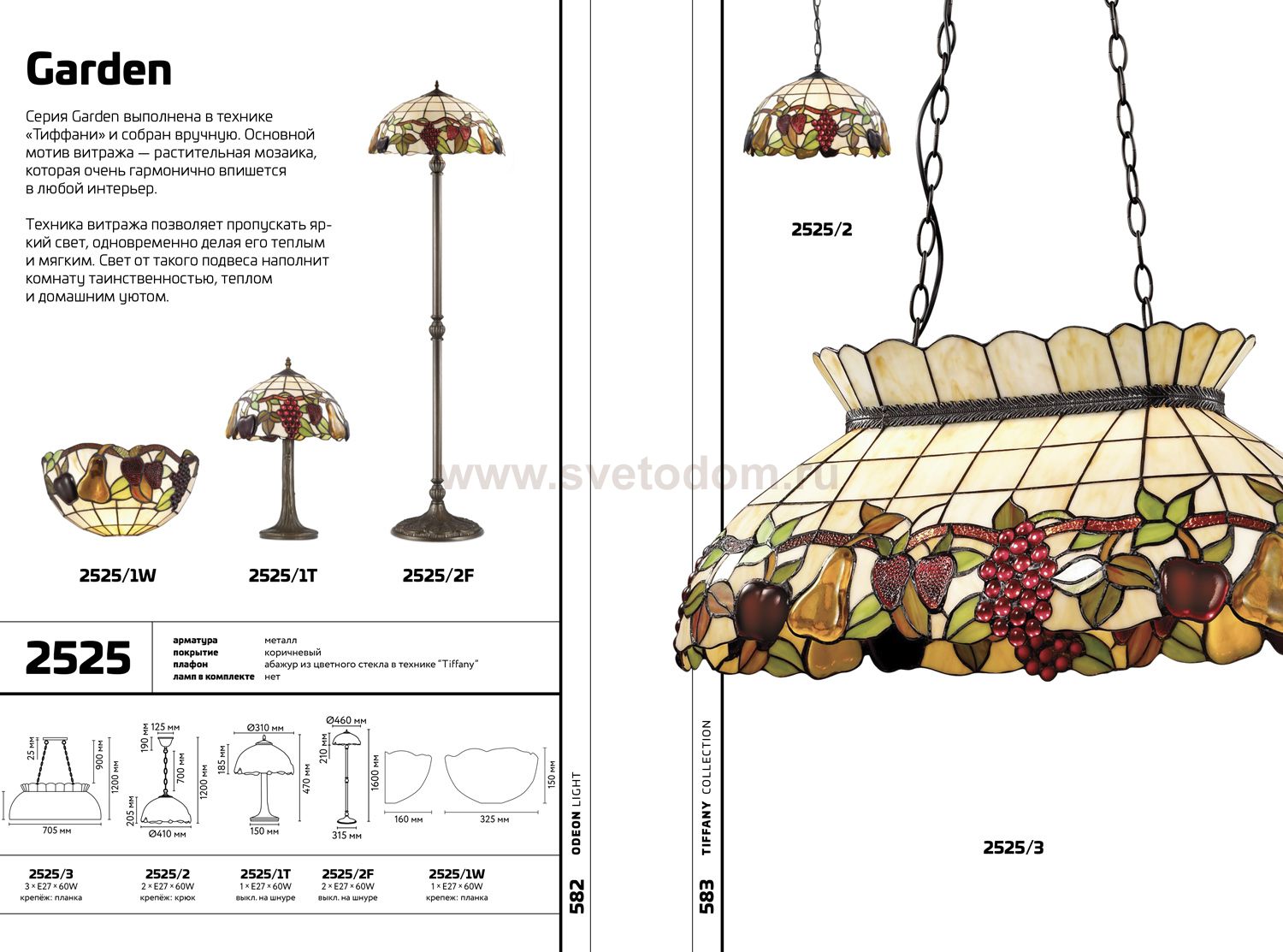 Храктерная особенность артикула 2525/2: Люстра 2525/2 серии Garden выполнена в технике "Тиффани" и собрана вручную. Основной мотив витража - растительная мозаика, которая очень гармонично впишется в любой интерьер. Техника витража позволяет пропускать яркий свет, одновременно делая его теплым и мягким. Свет от такой люстры наполнит комнату таинственностью, теплом и домашним уютом. Цоколь E27. Мощность 2*60W. Нет ламп в комплекте.