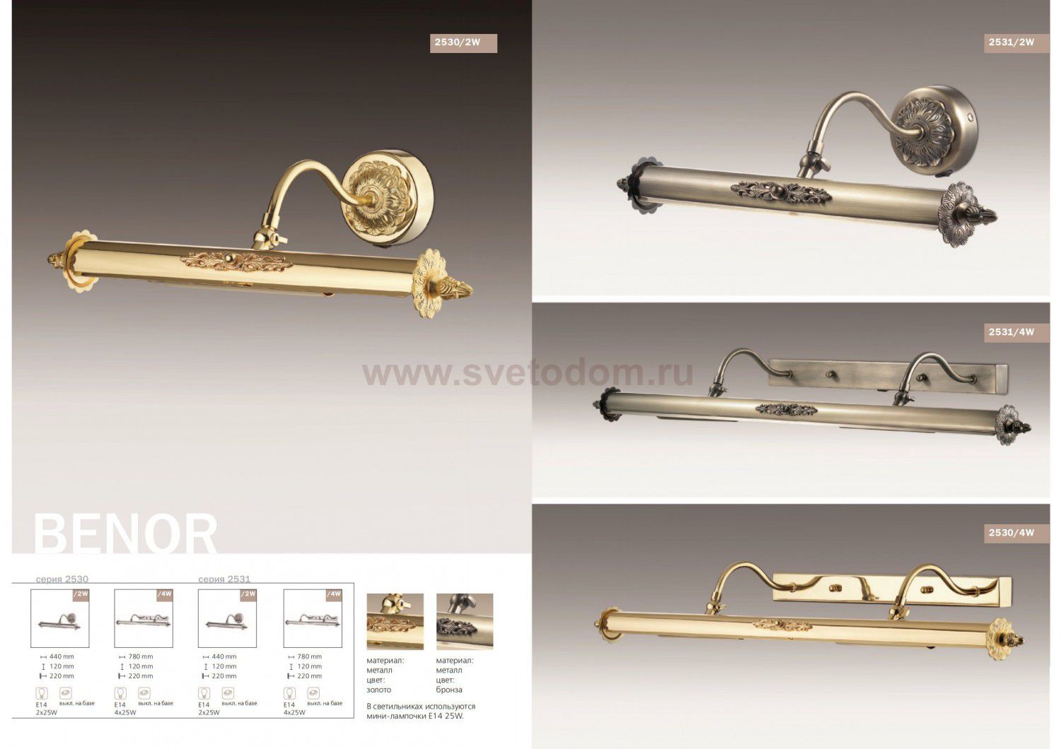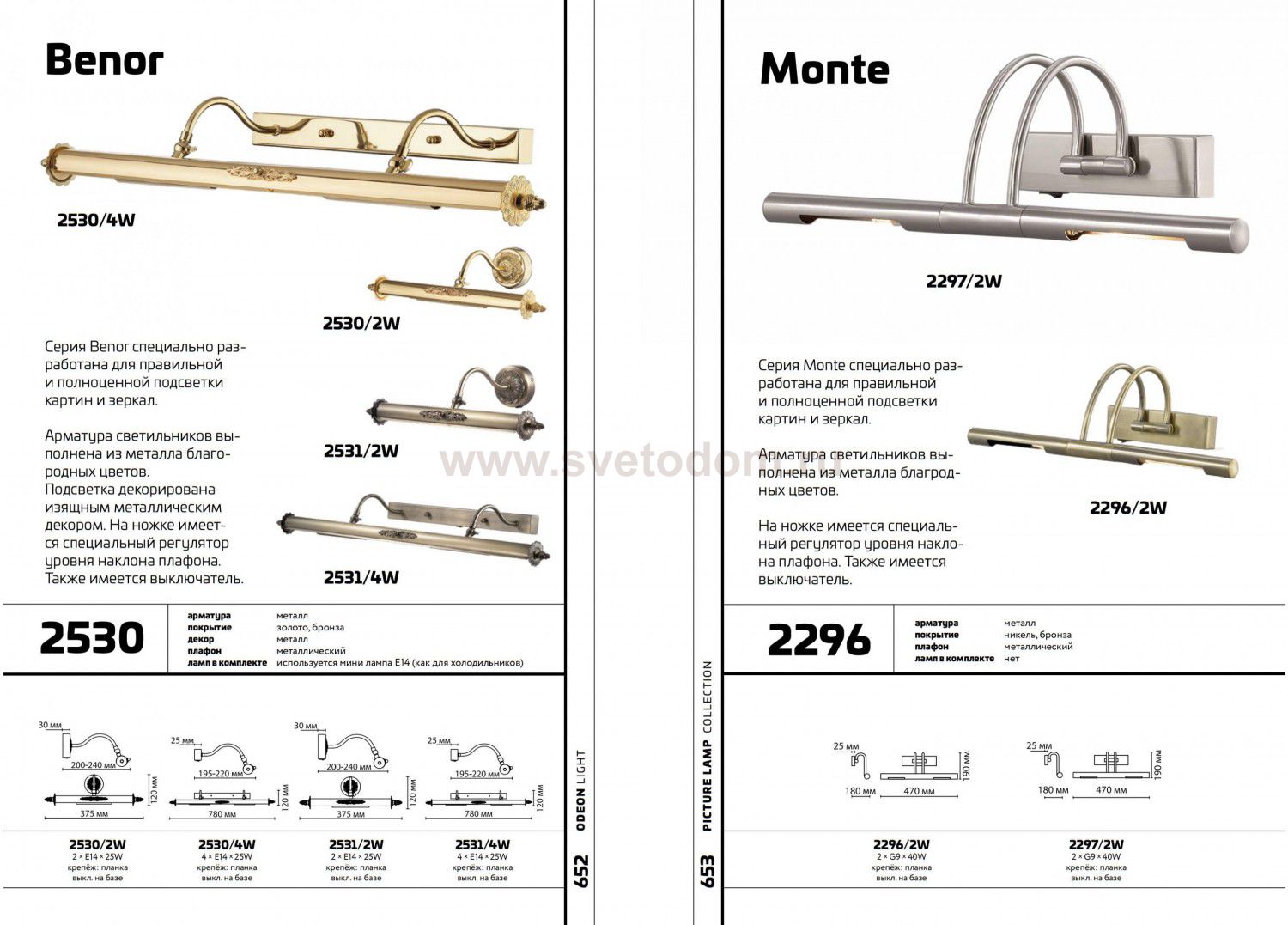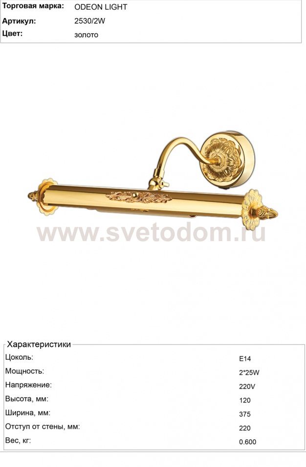 Подсветка для картин 2530 / 2W линии Benor специально разработана для правильной и полноценной подсветки картин и зеркал. Арматура светильника из металла цвета золото. Подсветка декорирована изящным металлическим декором. На ножке имеется специальный регулятор уровня наклона плафона. Также имеется выключатель. Цоколь E14. Мощность 2*25W. Нет ламп в комплекте.
