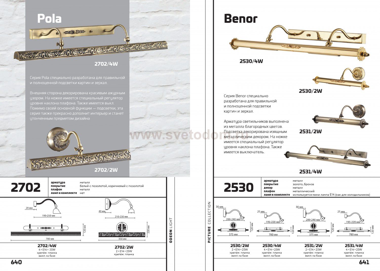 Храктерная особенность артикула 2530/4W: Подсветка для картин 2530/4W серии Benor специально разработана для правильной и полноценной подсветки картин и зеркал. Арматура светильника из металла цвета золото. Подсветка декорирована изящным металлическим декором. На ножке имеется специальный регулятор уровня наклона плафона. Также имеется выключатель. Цоколь E14. Мощность 4*25W. Нет ламп в комплекте.