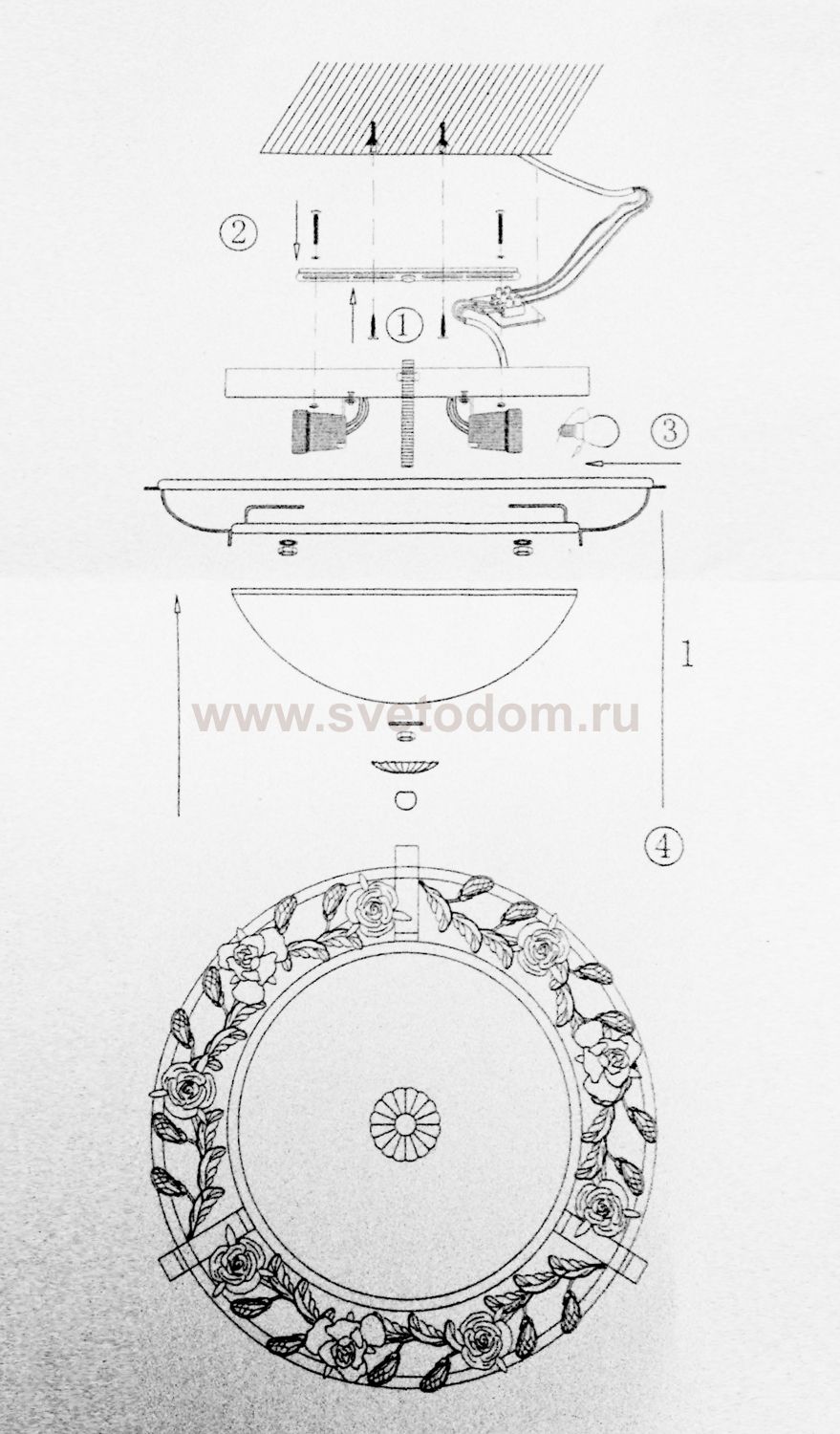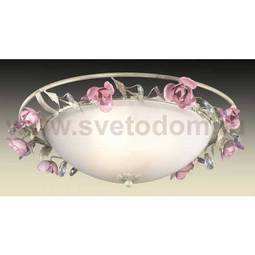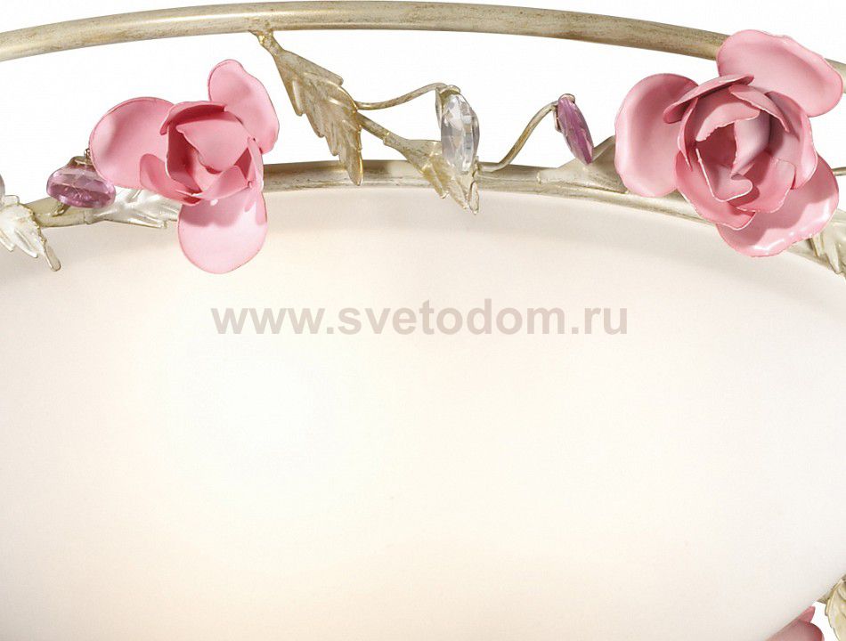плафон: рассеиватель из белого матового стекла с металлическим каркасом с цветочным декором и хрустальными элементами, арматура: металл, декор: металл, хрусталь Материал плафона