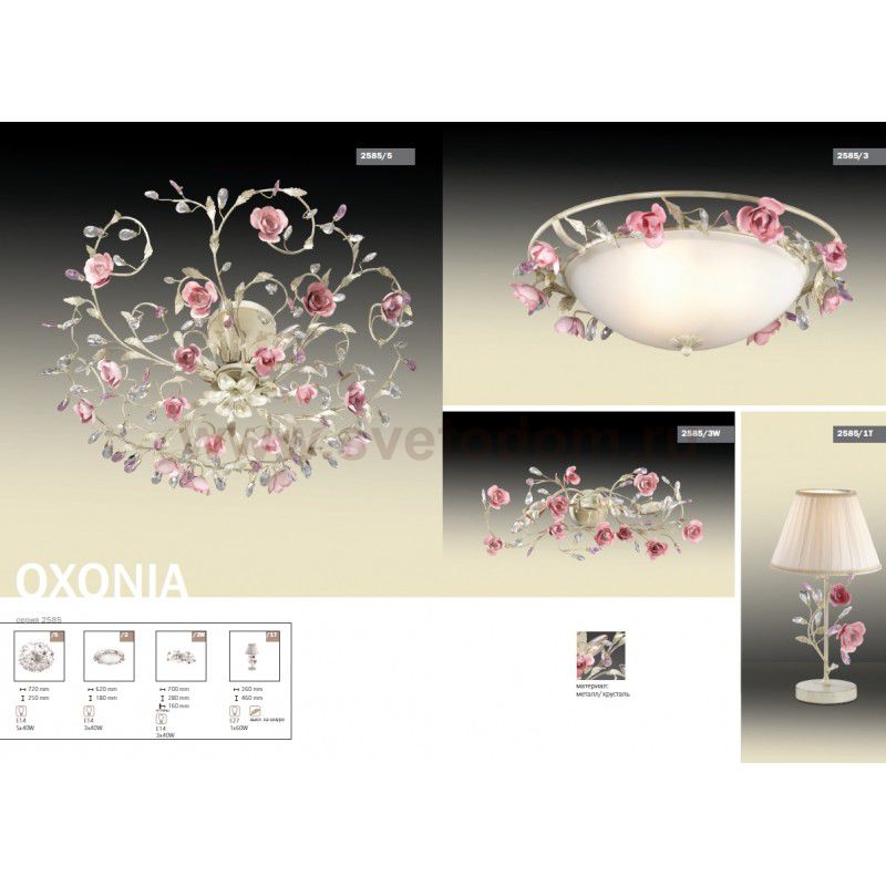 Люстра 2585 / 3 линии Oxonia украшена извивающимися тонкими веточками, декорированными изящными розами бледно - розового цвета, утонченными лепестками и прозрачным хрусталем. Белый плафон "алебастр" делает эту люстру легкой, прозрачной и невесомой. Цоколь E14. Мощность 3*40W. Нет ламп в комплекте.