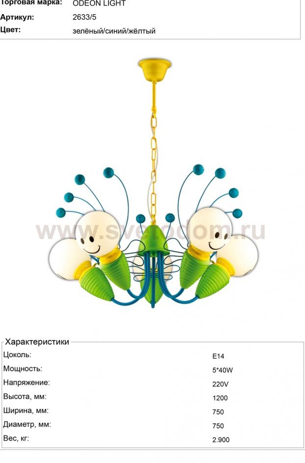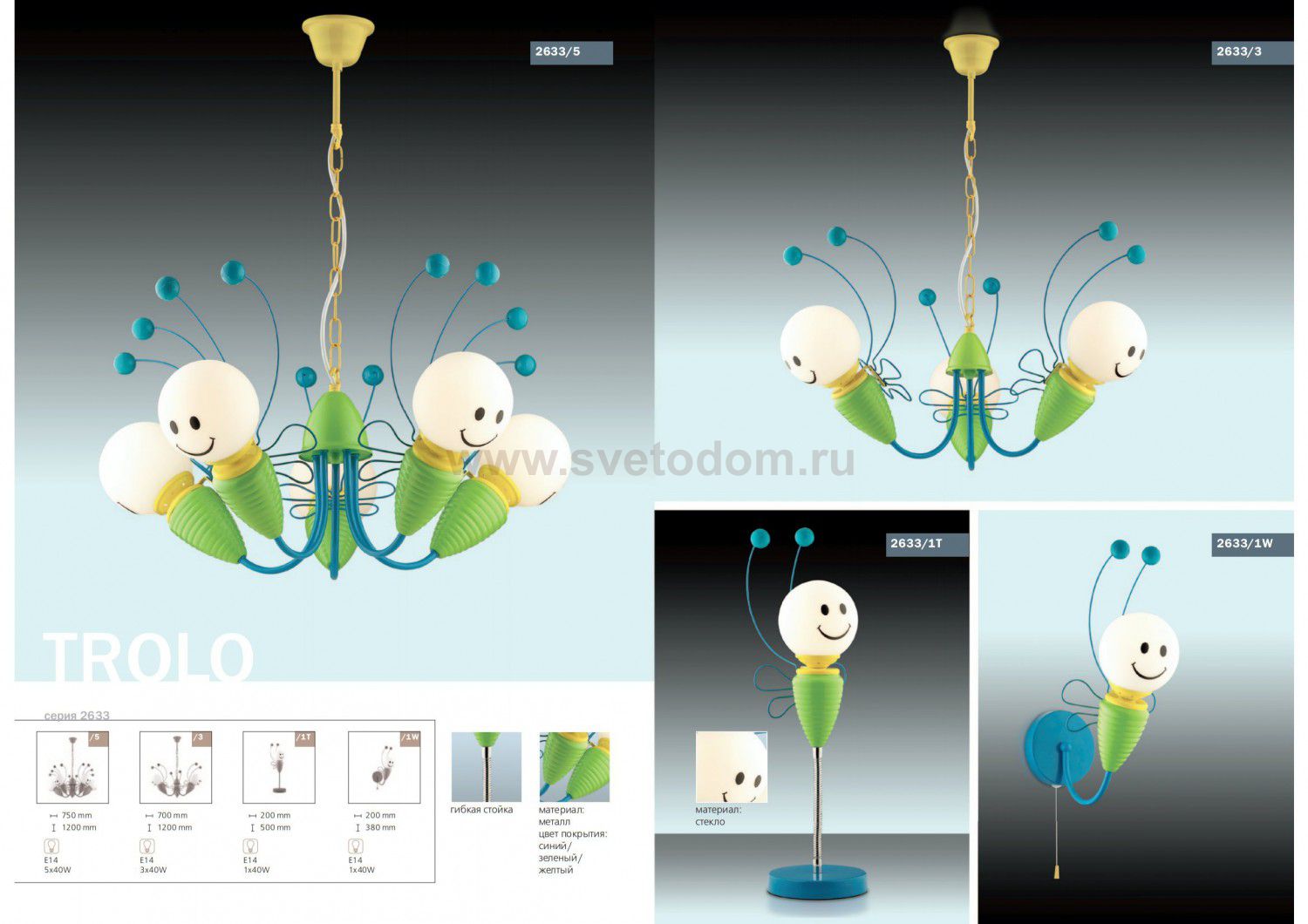Яркая и веселая люстра 2633 / 5 линии Trolo украсит интерьер детской комнаты. Забавные светлячки с доброй улыбкой ярко осветят комнату и создадут теплую, дружелюбную атмосферу. Цоколь E14. Мощность 5*40W. Нет ламп в комплекте.