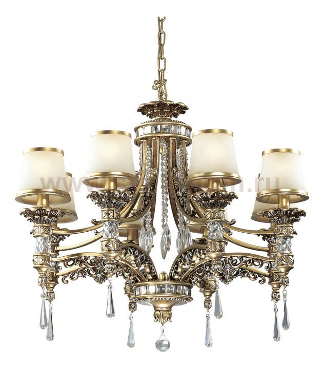 Люстра 2803 / 8 линии Peta покрыта бронзовым цветом, основание люстры украшено лепниной, хрустальными вставками и хрустальными подвесками высшего качества, матовые плафоны из стекла молочного цвета обрамлены золотой каймой. Люстра украсит любой интерьер и будет смотреться поистине роскошно и по - королевски. Цоколь E14. Мощность 8*60W. Нет ламп в комплекте.