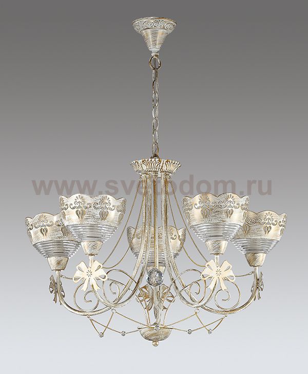 Отличный вариант домашнего освещения Odeon light Люстра потолочная 3143/5C серии FARFALLA оформлена в классическом стиле. Люстра состоит из роскошных плафонов, состоящих из стекла с тиснением и металлической части с ажурным узором, и белой с золотой патиной арматуры, украшенной металлическими декоративными элементами в виде бантиков и цепочками с жемчужными бусинками. Нежная, изящная, пленительная модель. Цоколь E27. Мощность 5*60W. Нет ламп в комплекте.
