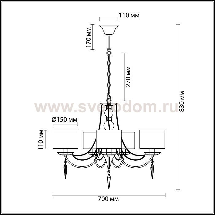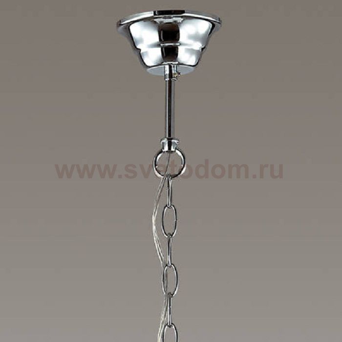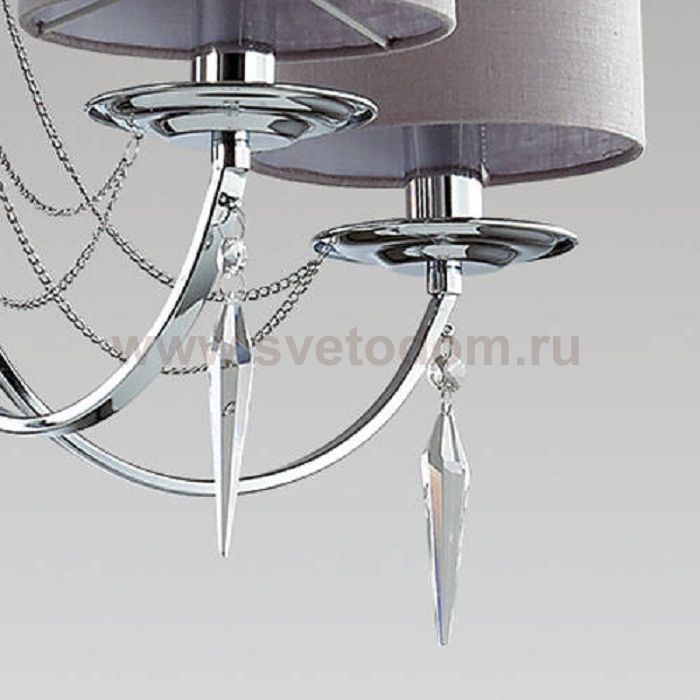 Арматура, декор: декоративные металлические цепочки, хрустальные подвески, стеклянные декоративные элементы на центральной штанге; плафон: тканевый абажур Материал плафона