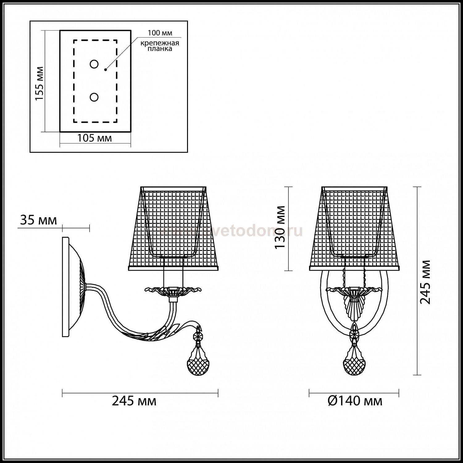 Арматура, декор: металл, хрустальные подвески; плафон: тканевый абажур Материал плафона