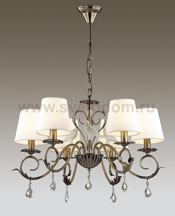 Отличный вариант домашнего освещения Odeon light Люстра 3217/6 серии BALDANI оформлена в классическом стиле. Люстра состоит из арматуры классического бронзового цвета, украшенной хрустальными подвесками и декоративными фигурками птичек, и тканевых абажуров белого цвета. Очень элегантная традиционная модель станет непревзойденным украшением Вашей комнаты. Цоколь E14. Мощность 6*60W. Нет ламп в комплекте.
