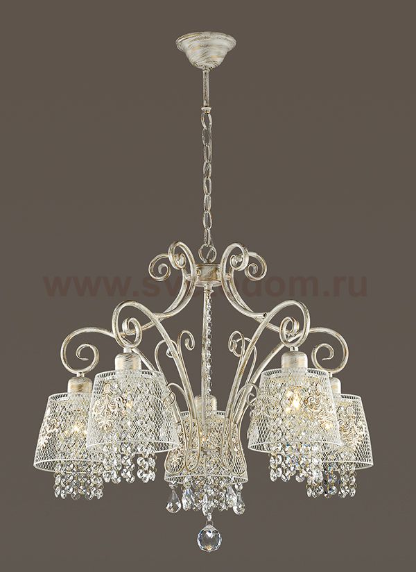 Отличный вариант домашнего освещения Odeon light Люстра 3284/5 серии CATALINA оформлена в классическом стиле. Люстра состоит из металлических сетчатых абажуров с кружевным декором, щедро украшенных хрустальными подвесками, и изысканной арматуры белого с золотой патиной цвета с хрустальной подвеской. Плавные, утонченные линии арматуры и эффектные плафоны несомненно украсят Ваш интерьер как нельзя лучше. Цоколь E14. Мощность 5*40W. Нет ламп в комплекте.