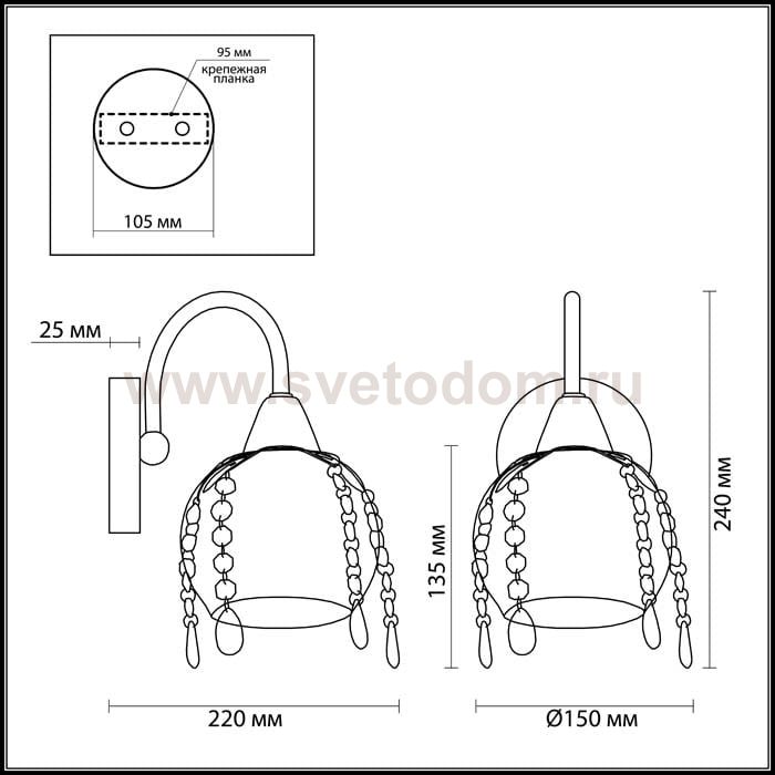Арматура, декор: металл; плафон: стекло, металлический декор, хрустальные подвески Материал плафона