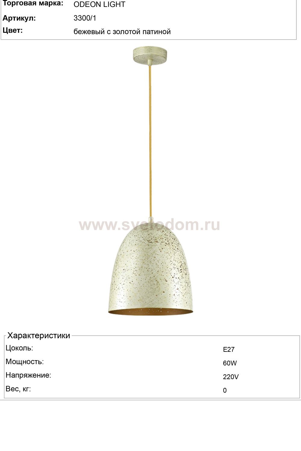 Подвесной светильник – это универсальный вариант, подходящий для любой комнаты. Сегодня производители предлагают огромный выбор таких моделей по самым разным ценам. В каталоге интернет-магазина «Светодом» мы собрали большое количество интересных и оригинальных светильников по выгодной стоимости. Вы можете приобрести их в Москве, Екатеринбурге и любом другом городе России. Подвесной светильник Odeon light 3300/1 сразу же привлечет внимание Ваших гостей благодаря стильному исполнению. Благородный дизайн позволит использовать эту модель практически в любом интерьере. Она обеспечит достаточно света и при этом легко монтируется. Чтобы купить подвесной светильник Odeon light 3300/1, воспользуйтесь формой на нашем сайте или позвоните менеджерам интернет-магазина.