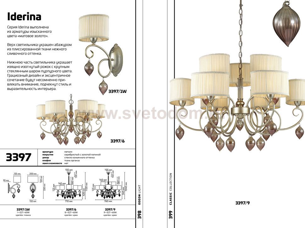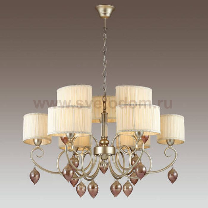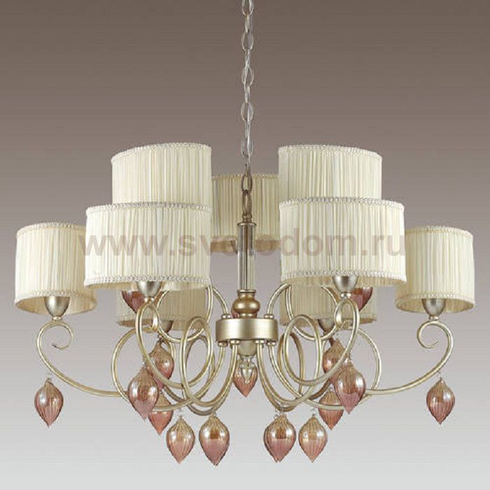 Храктерная особенность артикула 3397/9: Люстра 3397/9 серии Iderina выполнена из арматуры изысканного цвета "матовое золото". Верх люстры украшен абажурами из плиссированной ткани нежного сливаочного оттенка. Нижнюю часть светильника украшают изящно изогнутые рожки с крупными стеклянными шарами пурпурного цвета. Грациозный дизайн люстры и эксцентричное сочетание будут несомненно привлекать внимание, подчекнут стиль и выразительность интерьера. Цоколь E14. Мощность 9*40W. Нет ламп в комплекте.