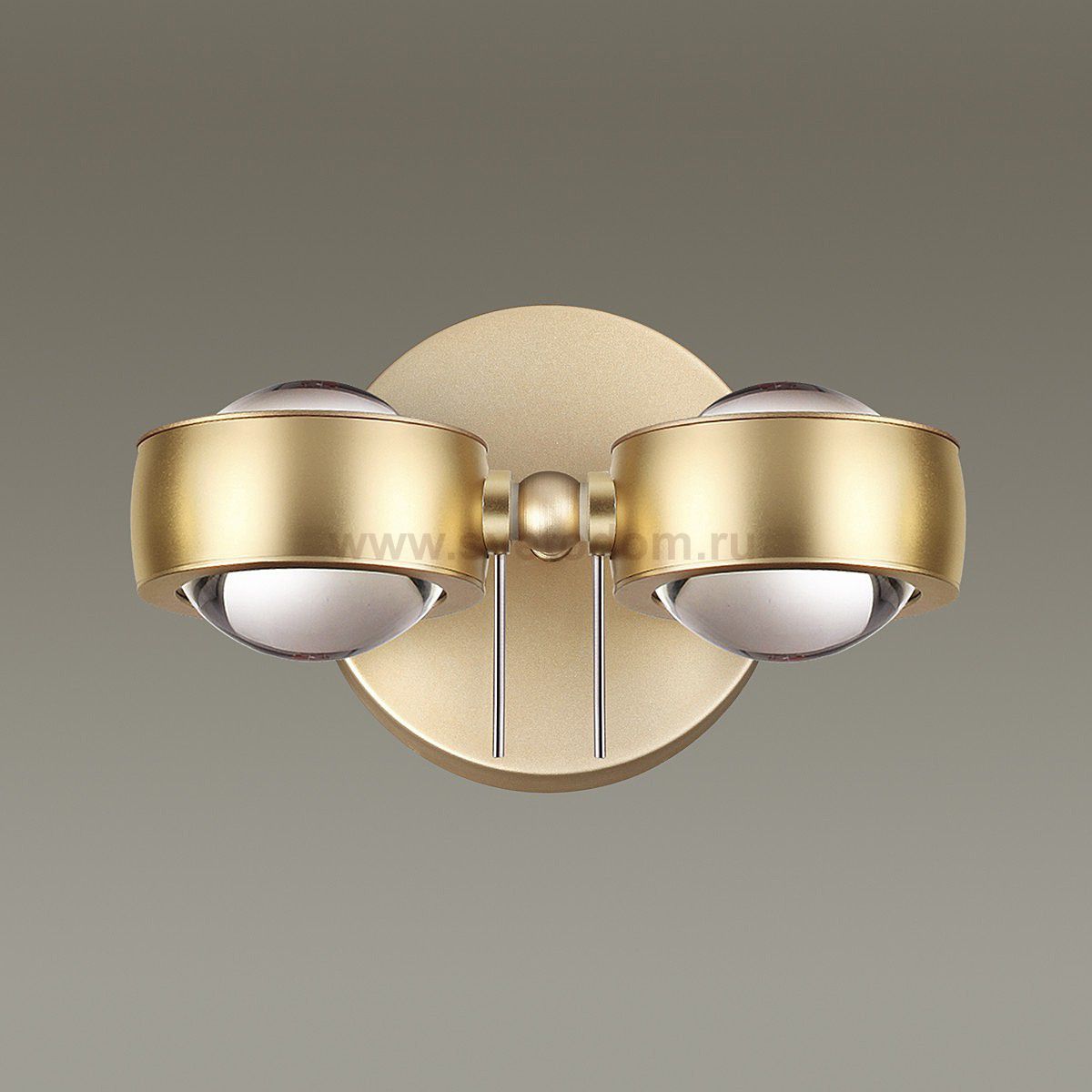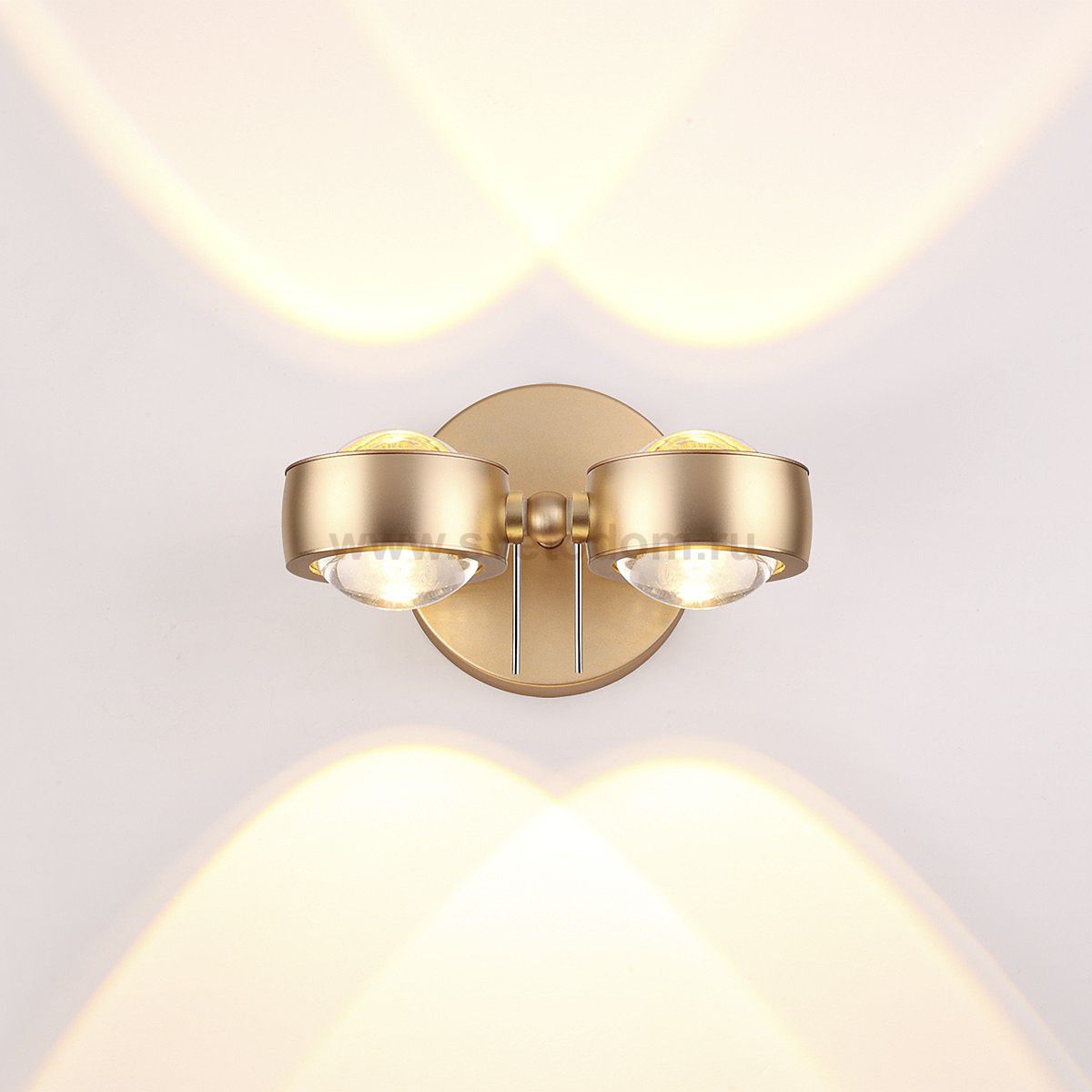 Изящный и стильный настенный светодиодный светильник в благородном матовом золотистом цвете с металлическими держателями для безопасного регулирования положения плафонов. В качестве рассеивателя на каждом плафоне используются две сферические линзы, дающие четыре эффектных световых луча. Угол поворота каждого плафона - 350°. Рассеиватель представляет собой линзу - сферу, которая способна увеличивать угол рассеивания.