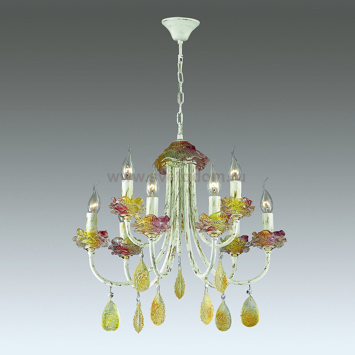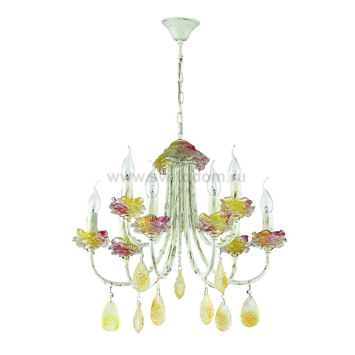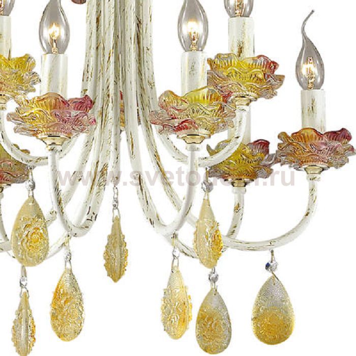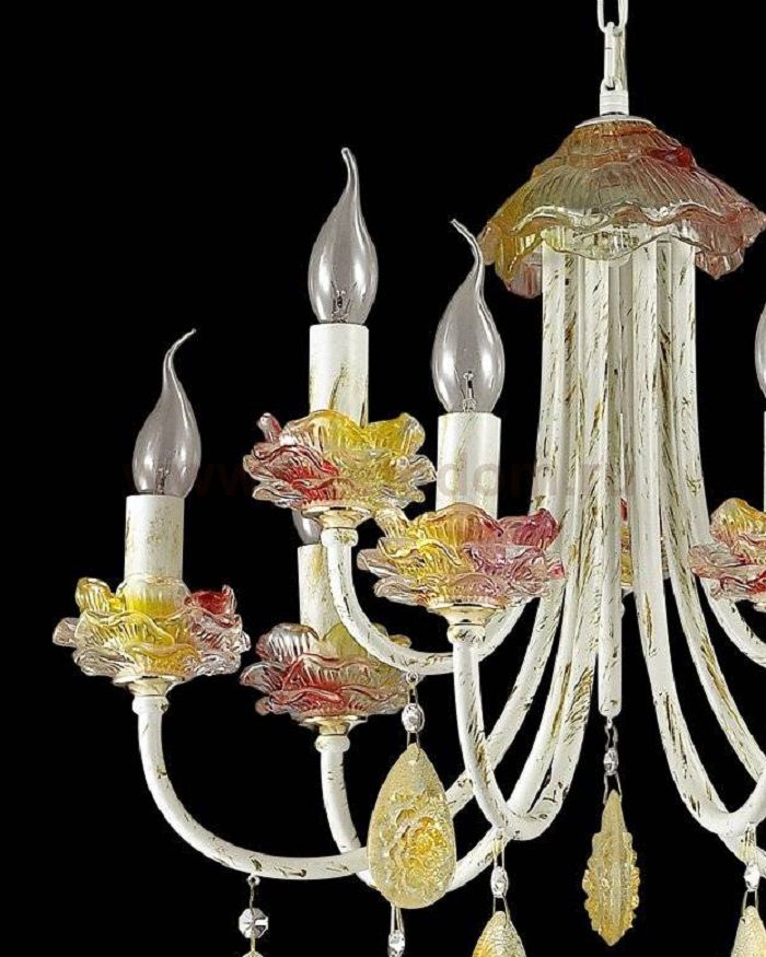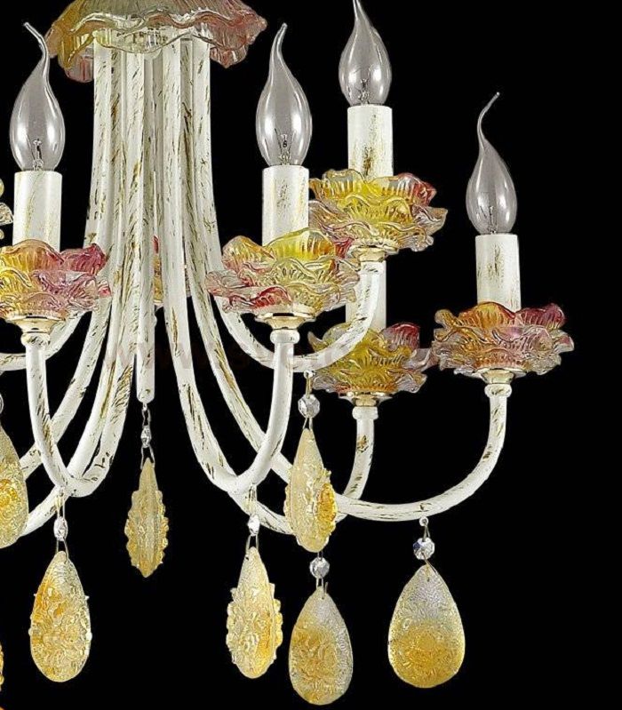 Люстра 3938 / 9 линии Corniola необычайно интересная своим дизайном, обязательно подойдет для ценителей ярких идей и индивидуальности. Люстра оформлена в классическом стиле, арматура светильника окрашена в белый цвет, покрытый золотой патиной. Украшают люстру декоративные подставки из цветного хрусталя, выполненные в виде розочек, а также крупный хрусталь солнечного янтарного цвета, обрамляющий дно светильника. Цоколь E14. Мощность 9*40W. Нет ламп в комплекте.