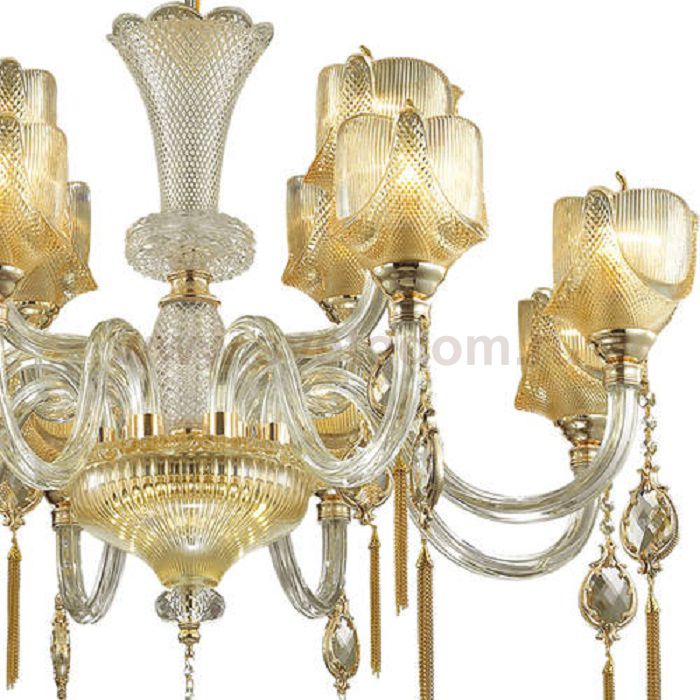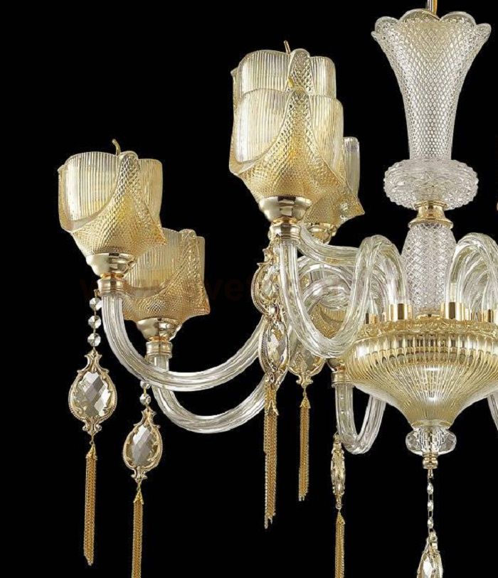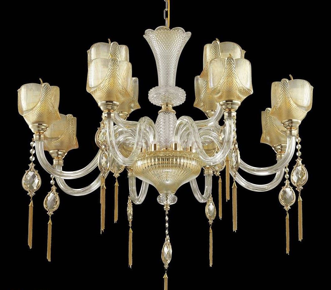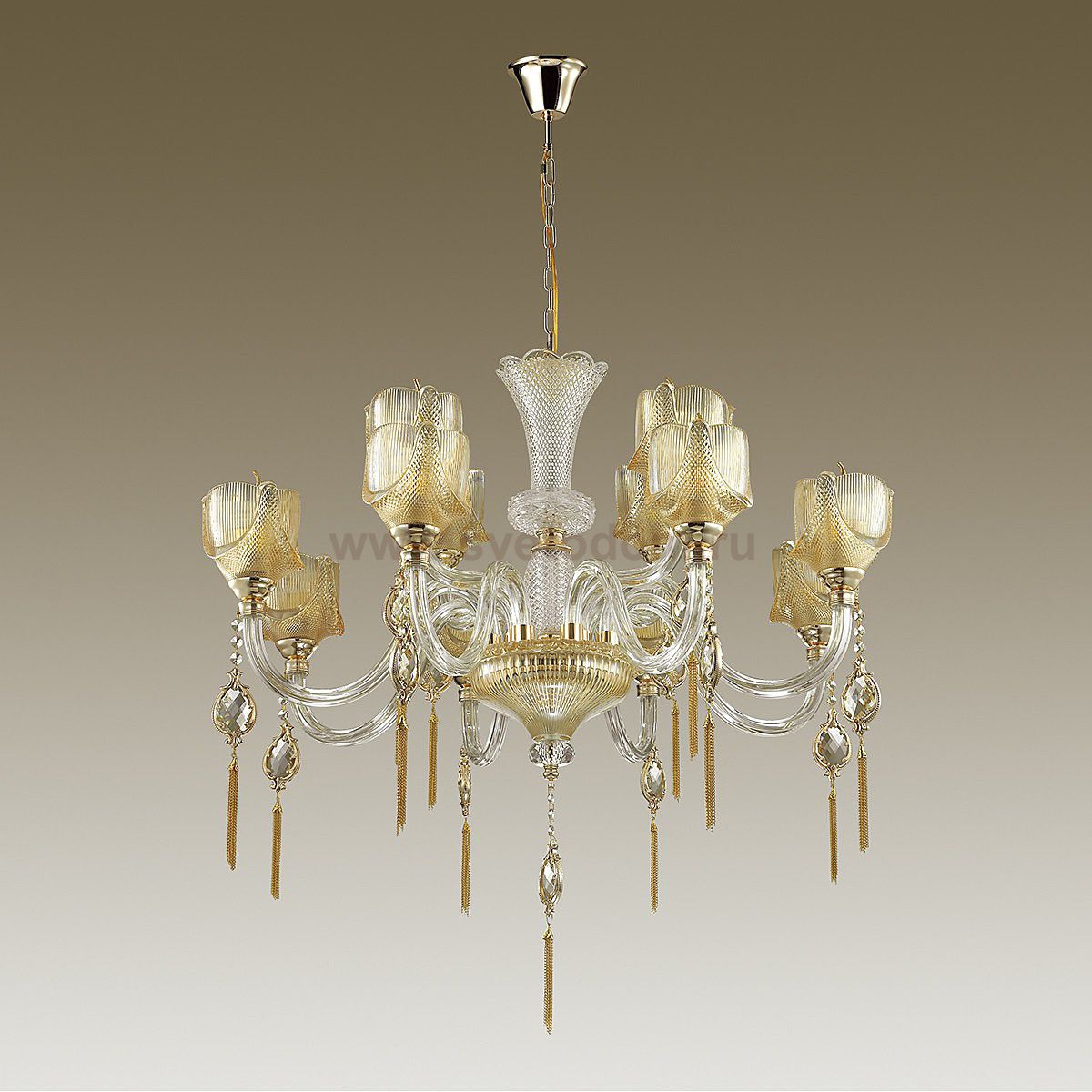 Люстра 4002/12 линии Corsa выполнена из металлической арматуры золотого цвета, а также из красивейшего рельефного стекла, из которого состоит весь светильник. Рожки украшены изысканными тонкими подвесками из металлической цепочки и прозрачного хрусталя. Изящные, великолепные формы стеклянного основания и массивных подсвечников делают люстру настоящим современным шедевром, а благородное сочетание прозрачного стекла с цветом "шампань", способно преображать все окружающее пространство. Цоколь E14. Мощность 8*40W. Нет ламп в комплекте.