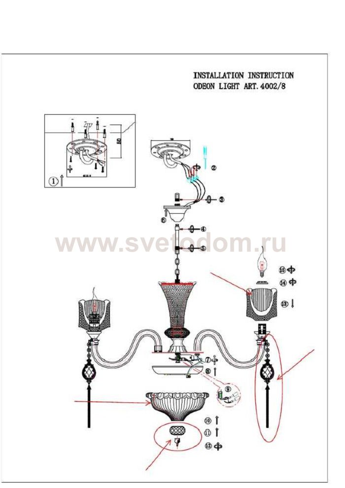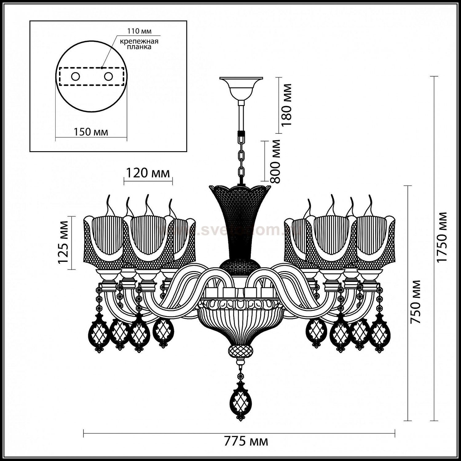 арматура, декор: металл, стекло, хрусталь, декоративные цепочки с хрусталем; плафон: стекло Материал плафона