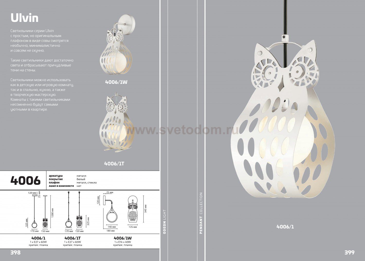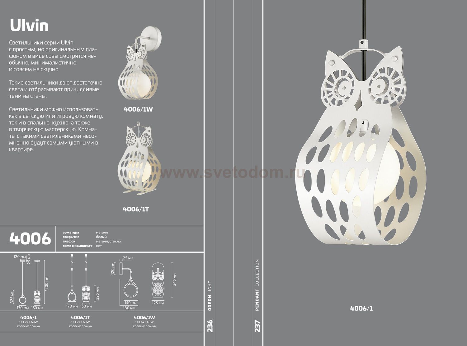 Настольная лампа 4006 / 1T линии Ulvin с простым, но оригинальным плафоном в виде совы смотрится необычно, минималистично и совсем не скучно. Такой светильник дает достаточно света и отбрасывает причудливые тени на стены. Светильник можно использовать как в детскую или игровую комнату, так и в спальню, кухню, а также в творческую мастерскую. Комната с таким светильником несомненно будет самой уютной в квартире. Цоколь E27. Мощность 1*60W. Нет ламп в комплекте.