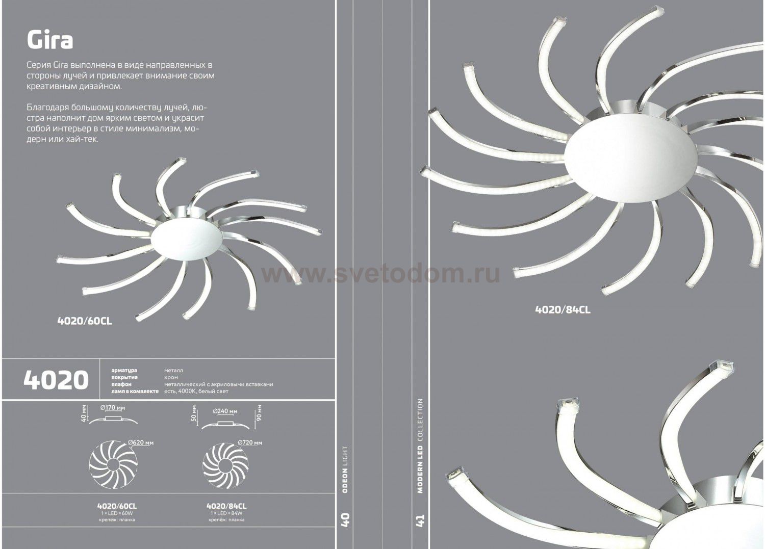 Удивительная модель 4020/60CL от фабрики Odeon light (Италия) серии GIRA представляет собой люстру потолочную выполненный по технически выверенным чертежам и эскизам итальянских дизайнеров. Подходит как для бытового, так и для общественного использования со стандартными и диодными лампами.