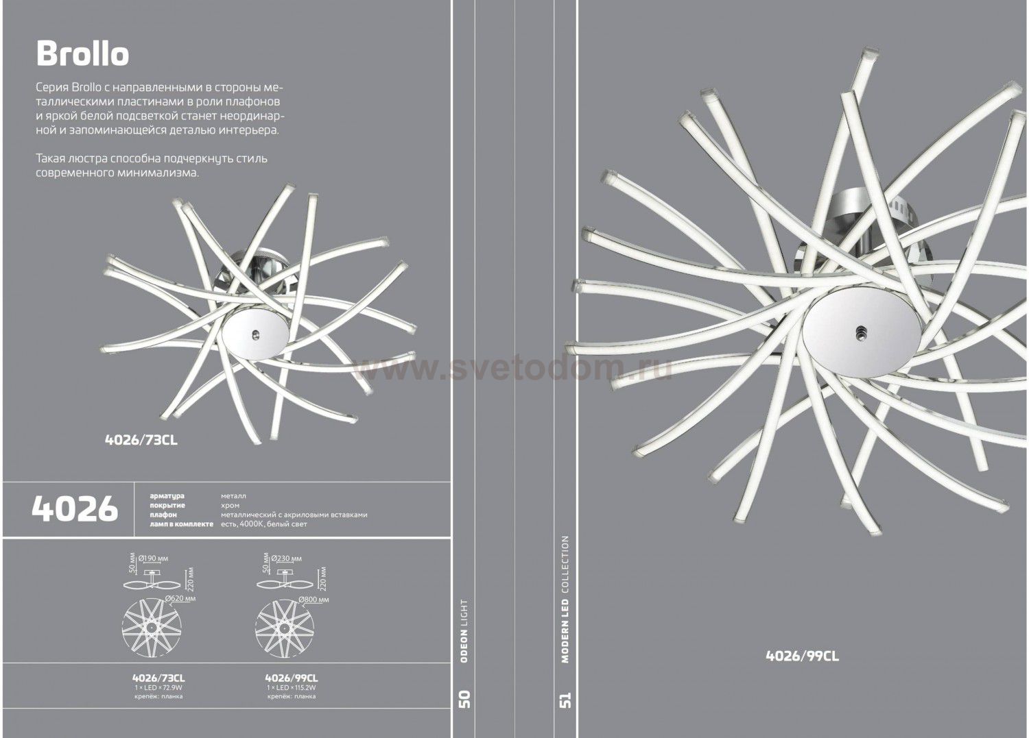 Очень необычная люстра 4026 / 99CL линии Brollo с направленными в стороны металлическими пластинами в роли плафонов и яркой белой подсветкой станет неординарной и запоминающейся деталью интерьера. Такая люстра способна подчеркнуть стиль современного минимализма. Цоколь LED. Мощность 115.2W.