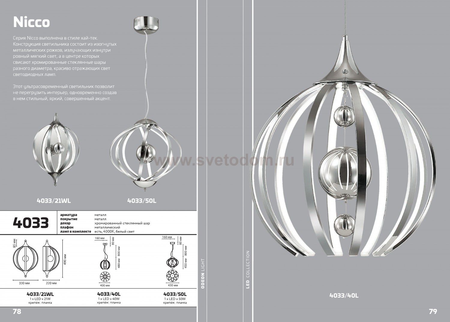 Люстра 4033 / 40L линии NICCO выполнена в стиле хай - тек. Конструкция светильника состоит из изогнутых металлических рожков, излучающих изнутри ровный мягкий свет, а в центре которых свисают хромированные стеклянные шары разного диаметра, красиво отражающих свет светодиодных ламп. Этот ультрасовременный светильник позволит не перегрузить интерьер, одновременно создав в нем стильный, яркий, совершенный акцент. Цоколь LED. Мощность 40W.