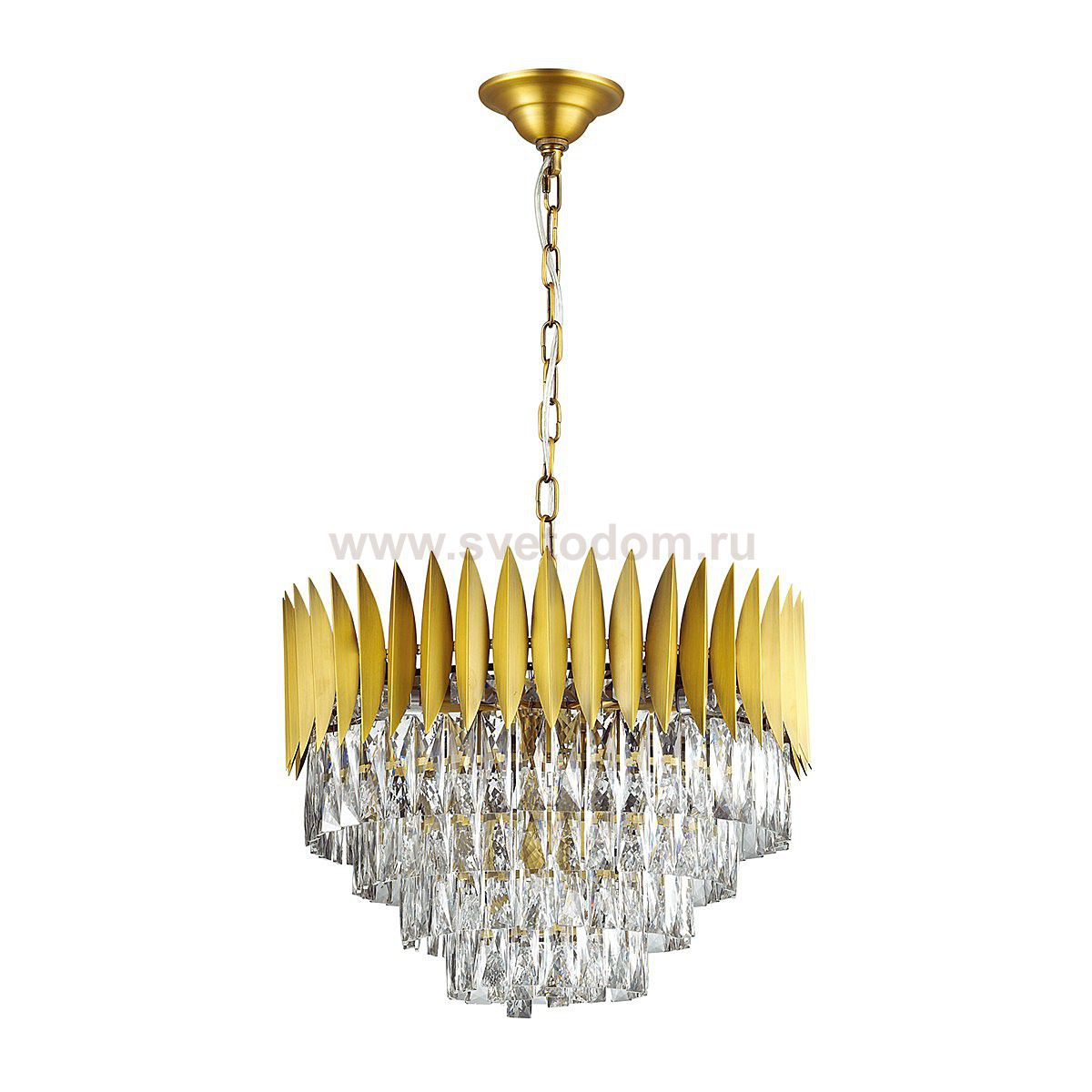Завораживающая линия Valetta отличается оригинальным дизайном и выдержана в духе ар-деко. Многоярусный плафон состоит из сверкающих хрустальных подвесок геометрической формы и широкого обруча из золотых элементов в виде согнутых листьев. Ломаные линии и объемные формы светильника будут смотреться свежо и динамично в дизайне классического интерьера, а благородное покрытие и эффектный блеск кристаллов преобразят пространство и создадут изысканную игру света.