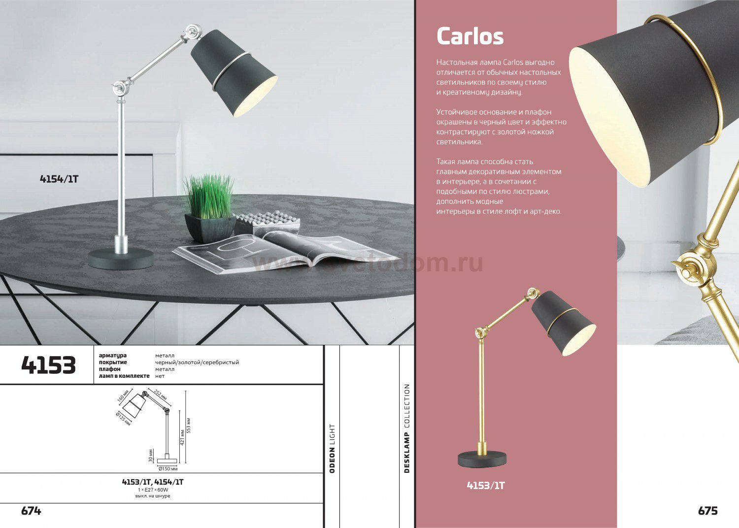 Настольная лампа линии Carlos выгодно отличается от обычных настольных светильников по своему стилю и креативному дизайну. Устойчивое основание и плафон окрашены в черный цвет и эффектно контрастируют с золотой ножкой светильника. Такая лампа способна стать главным декоративным элементом в интерьере, а в сочетании с подобными по стилю люстрами, дополнить модные интерьеры в стиле лофт и арт - деко.