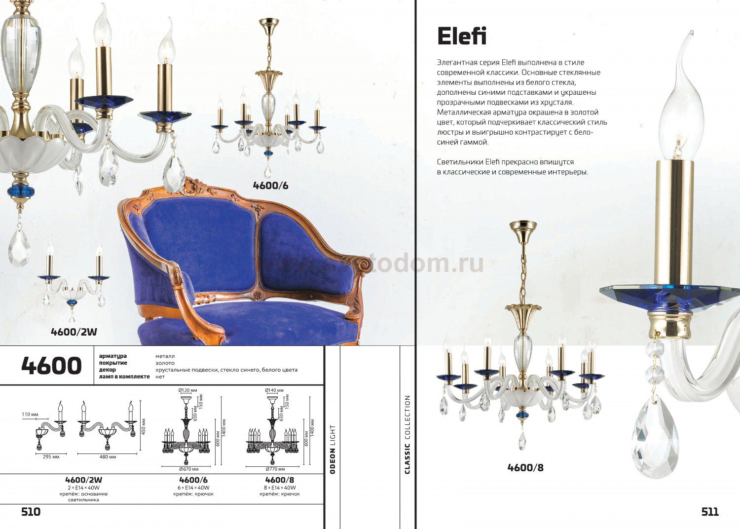 Элегантная линия Elefi выполнена в стиле современной классики. Основные стеклянные элементы выполнены из белого стекла, дополнены синими подставками и украшены прозрачными подвесками из хрусталя. Металлическая арматура окрашена в золотой цвет, который подчеркивает классический стиль люстры и выигрышно контрастирует с бело - синей гаммой. Светильник Elefi прекрасно впишется в классические и современные интерьеры и подчеркнет индивидуальность.