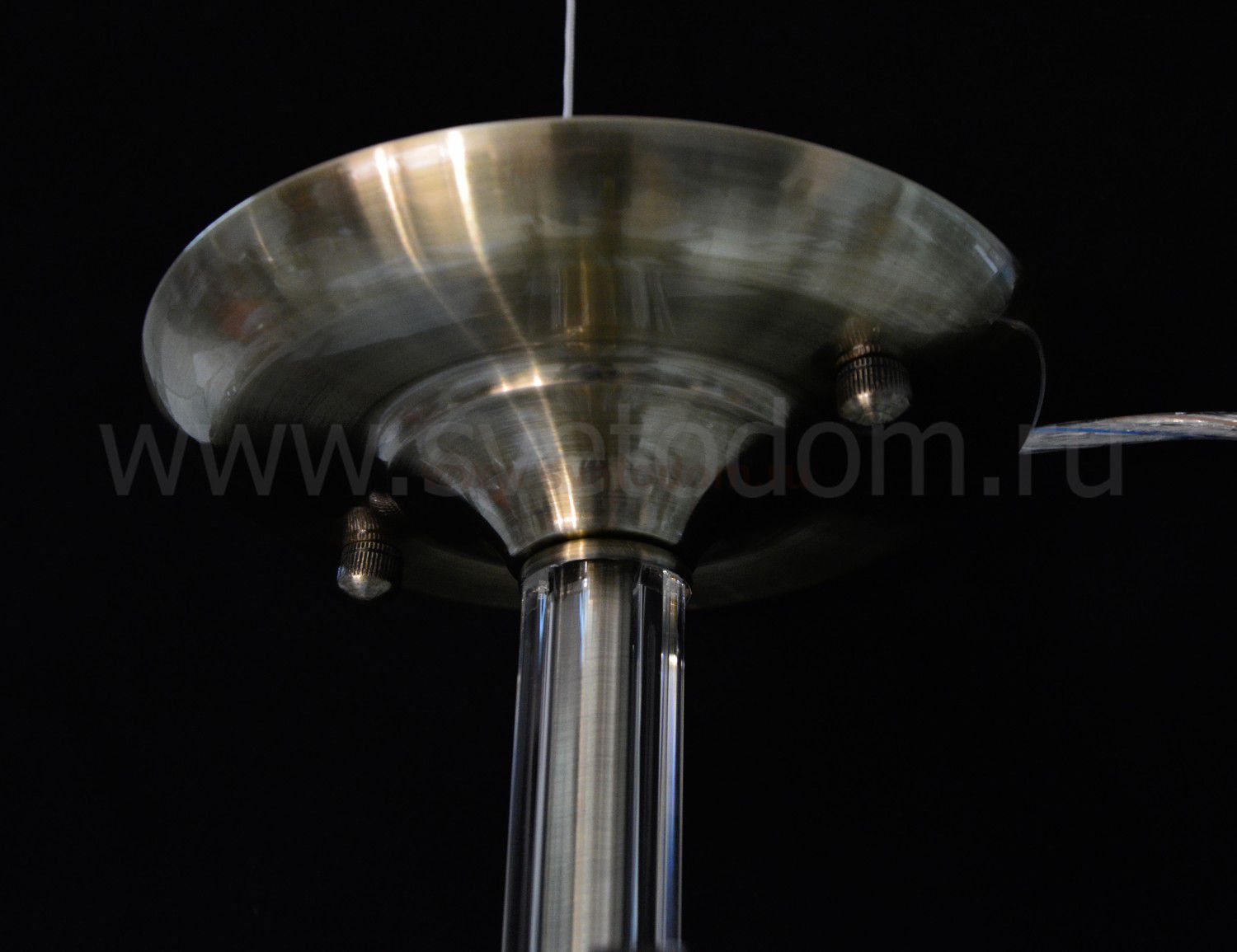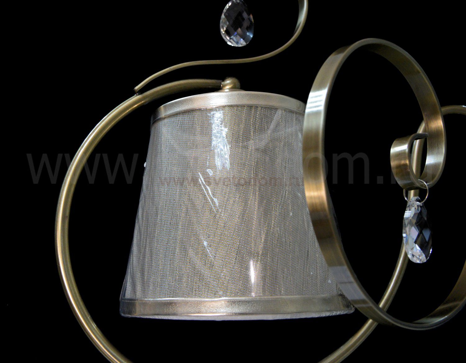Абажуры и арматура светильников выполнены в разных цветах, с несколькими видами арматуры. Основание люстры украшено стеклянным декоративным элементом, а завитки рожков украшают подвески.