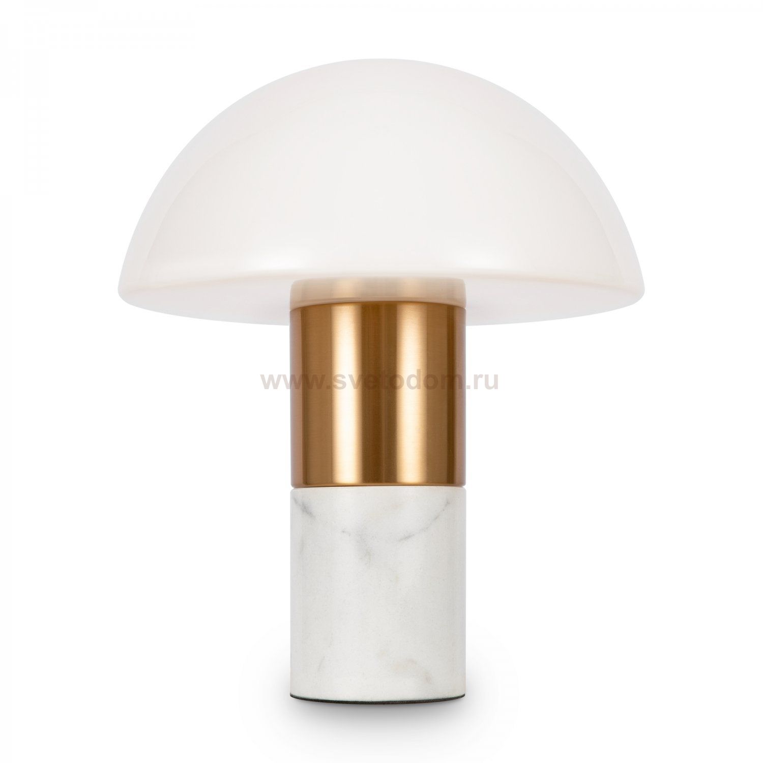 Материал арматуры — метал, цвет — латунь. Основание - белый мрамор с серым рисунком. Плафон из глянцевого стекла в форме полушара. Источник света — лампа с цоколем E14