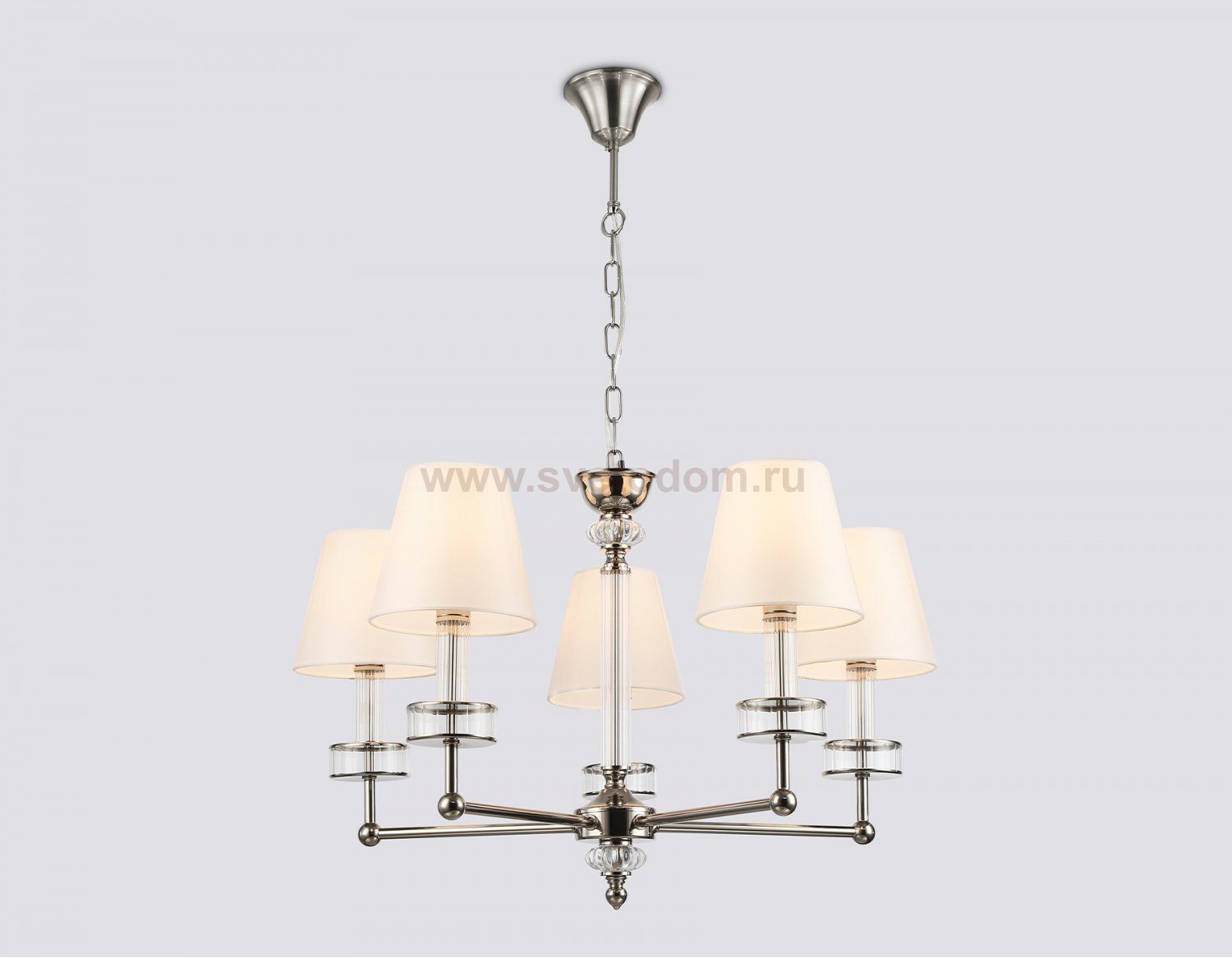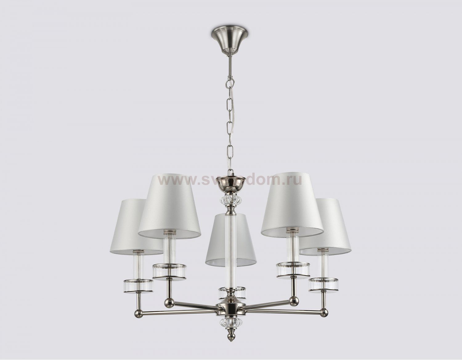 Подвесная люстра с абажурами и хрусталем из коллекции HIGH LIGHT. Модель LH71001 представлена в стиле неоклассика. Люстра выполнена из металла цвета никель, тканевых плафонов белого цвета и декорирована превосходным прозрачным хрусталем. Для данной модели подойдут лампы с цоколем Е14. Люстра будет прекрасным дополнением в любом помещении.