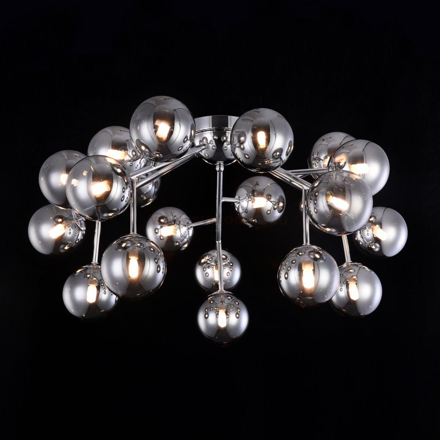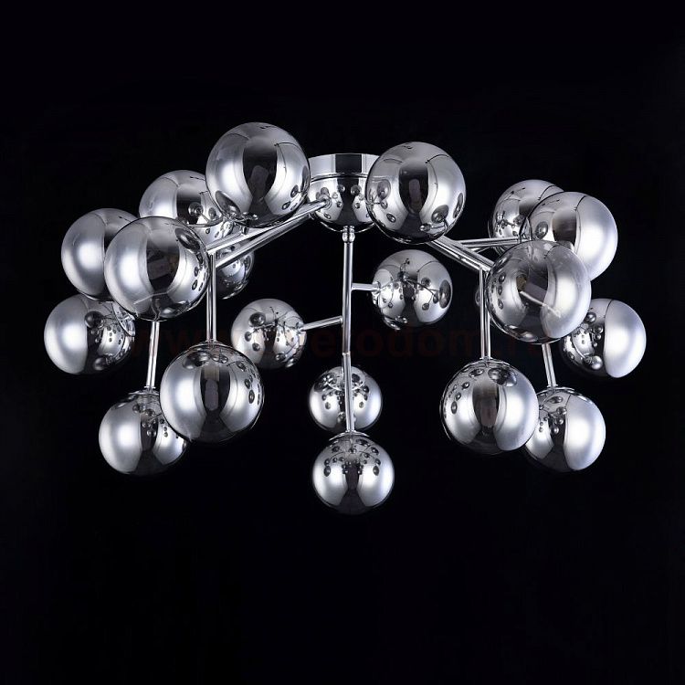 Металлическая арматура в четырех цветах: матовый черный, хром, золото, латунь. Плафоны — выдувное стекло. Цвета — дымчатый, янтарный, коньячный. Дизайн с имитацией молекулярной структуры. Высота подвесных светильников регулируется тросом. Лампа с цоколем G9.