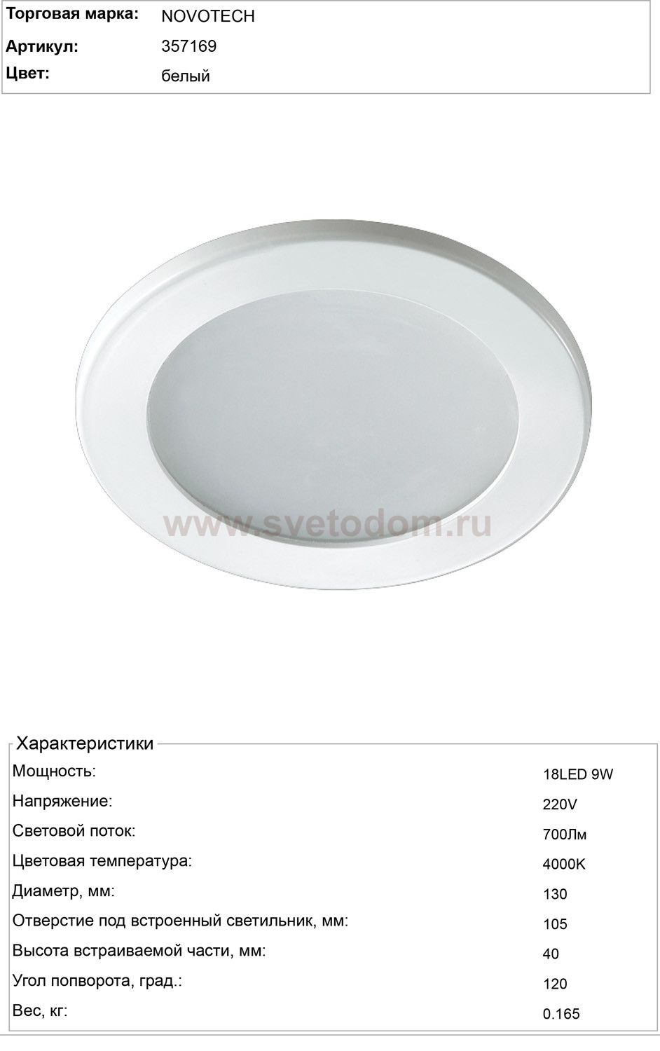 Встраиваемый светодиодный светильник на базе светодиодных источнтков света модели Novotech 357169 из серии LUNA отличается следующим качеством: Корпус светильника произведен из алюминия. Это металл, основными достоинствами которого являются — устойчивость к практически всем видам негативного воздействия окружающей среды, коррозии, небольшой вес, по сравнению с другими видами металла и экологическая безопасность материала. Рассеиватель сделан из матового пластика. Он отличается повышенной стойкостью к механическим повреждениям и защищенностью от факторов внешней среды.