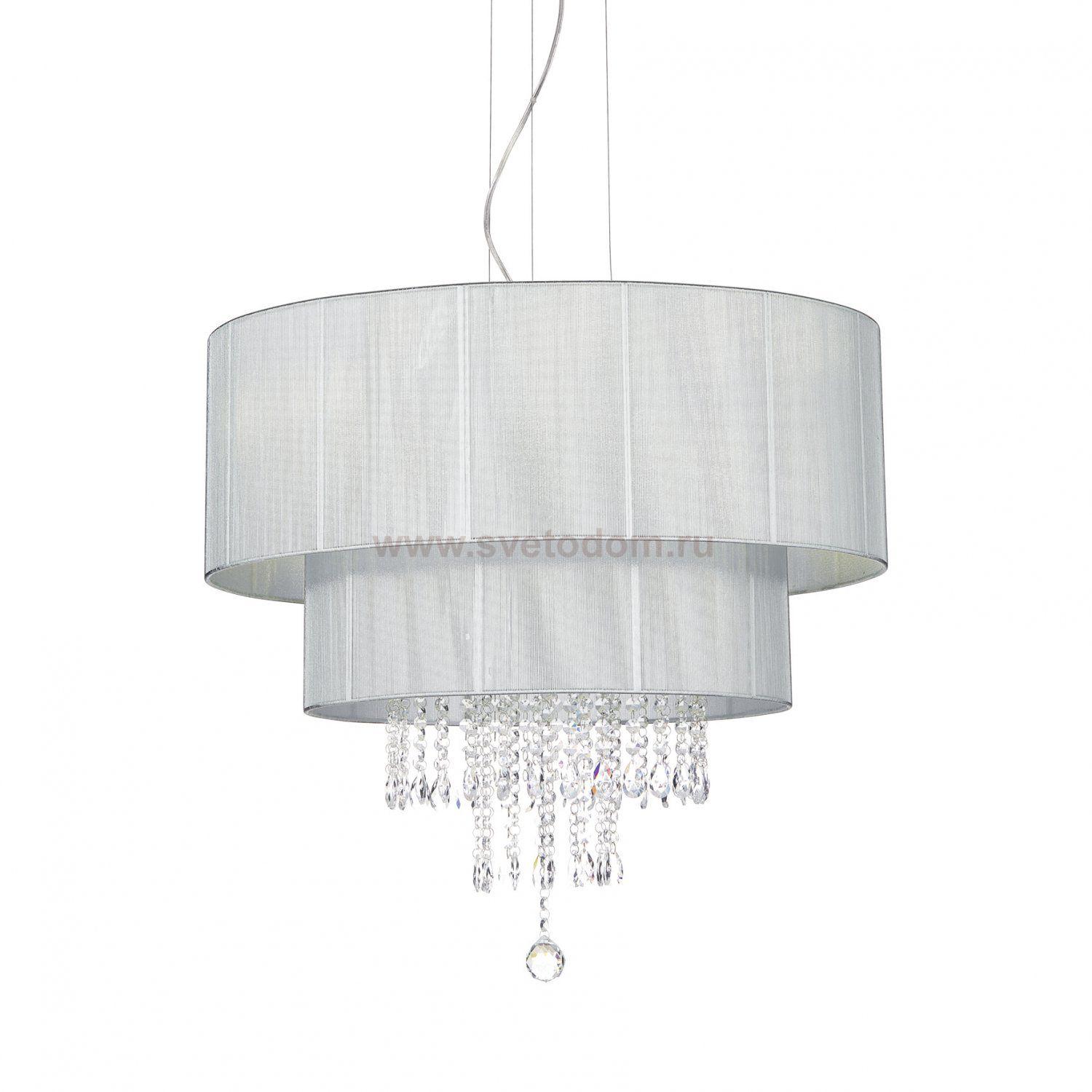 Арамтура в хроме. Рассеиватель из материала ПВХ с металлическим оттенком и нитями. Подвески из хрусталя с фацетом. Подвесы с тросиками и регулируются по длине.