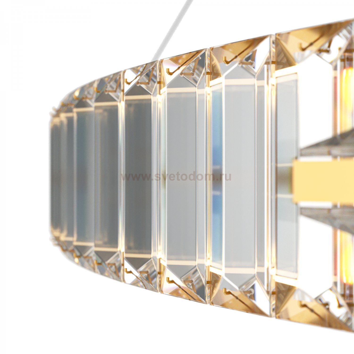Металлическая арматура в золотом цвете. Асимметричный хрустальный декор. Трендовая форма окружности. LED-источник света с температурой 4000К. Высокий индекс цветопередачи 90Ra.
