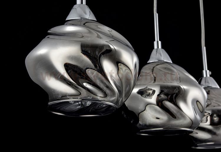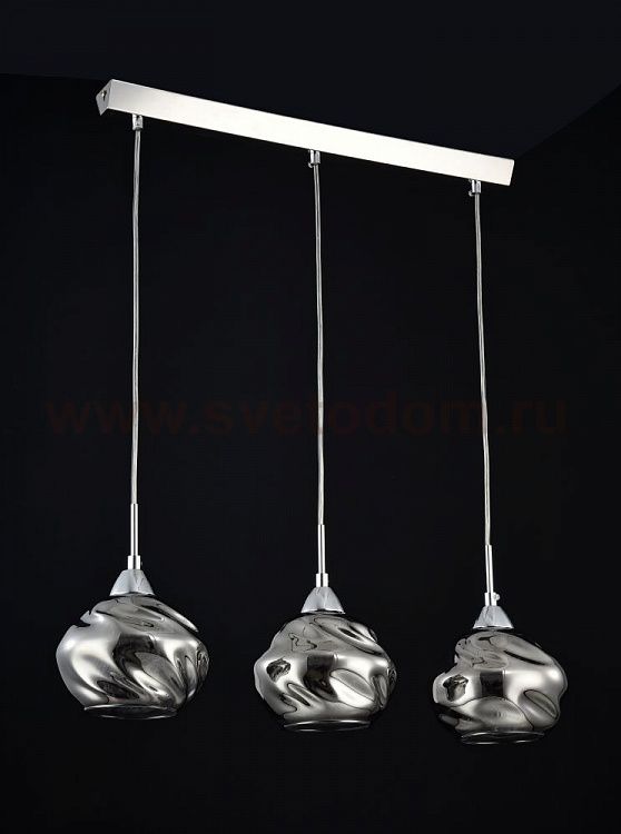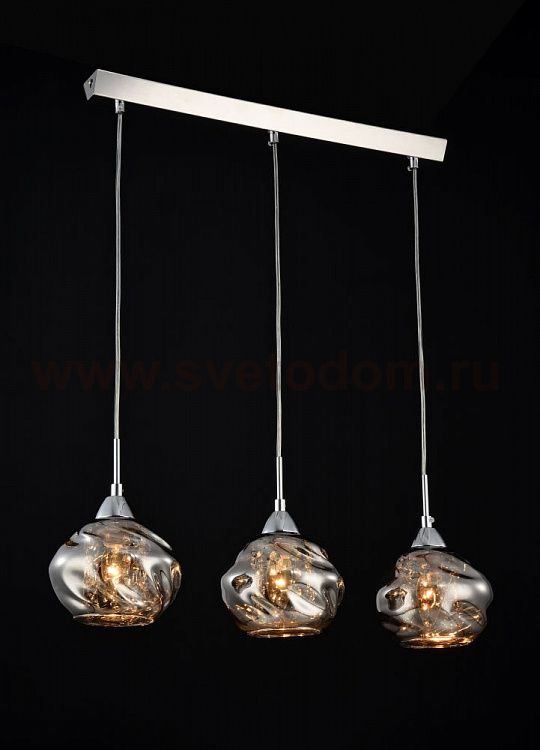 Особенности модели P244-PL-03-N: Космическая форма стеклянных плафонов формирует необычный облик светильников серии Haze. Дымчатые плафоны надежно скрывают от глаз наблюдателя лампу и подвески из кристаллов, которые при включенном свете создают неповторимые иллюзорные образы. Арматура изготовлена из хромированного металла. Модели серии представлены одиночным светильником и линейной композицией из трех светильников.