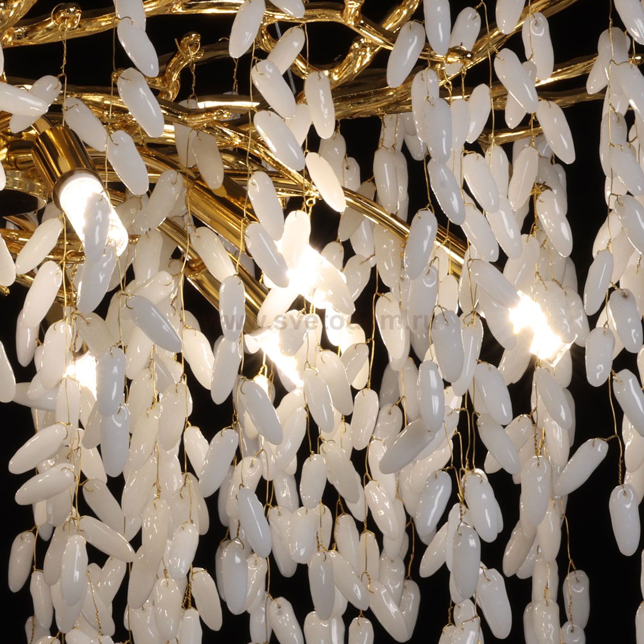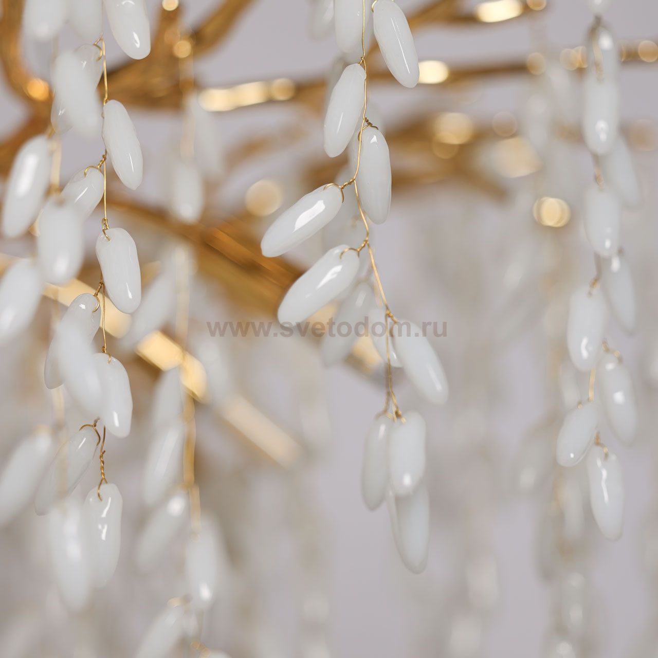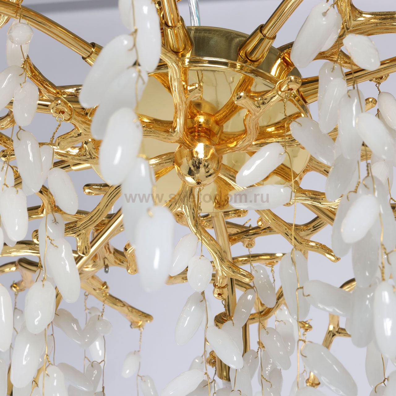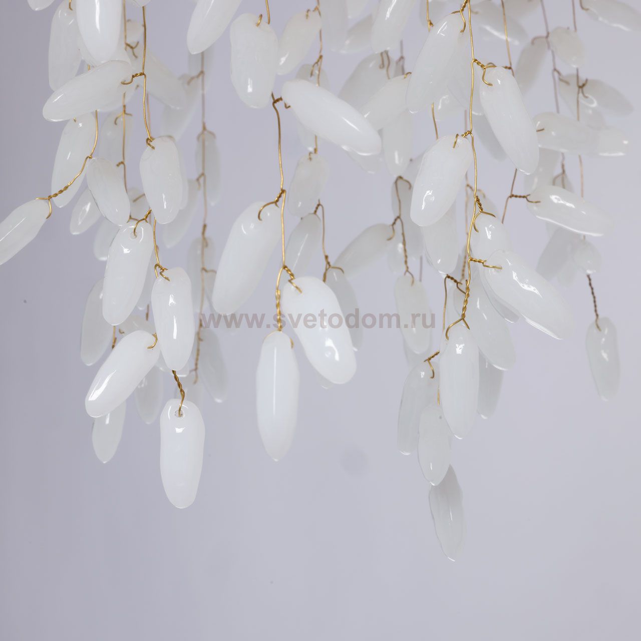 Основание подвесной люстры выполнено по технологии художественного литья из сплава алюминия с цинком и гальванизировано в цвет золота. Потолочная чаша закрыта фактурным художественным литьем. Люстра декорирована гроздьями из белого матового стекла. Комментарий