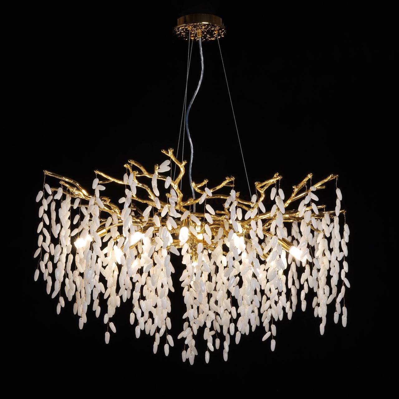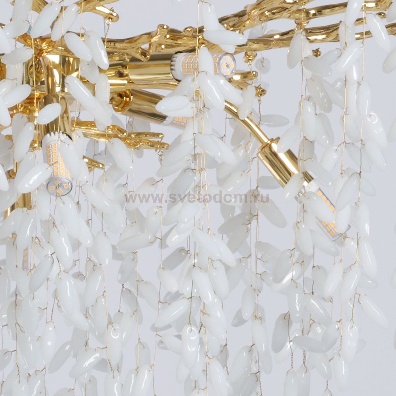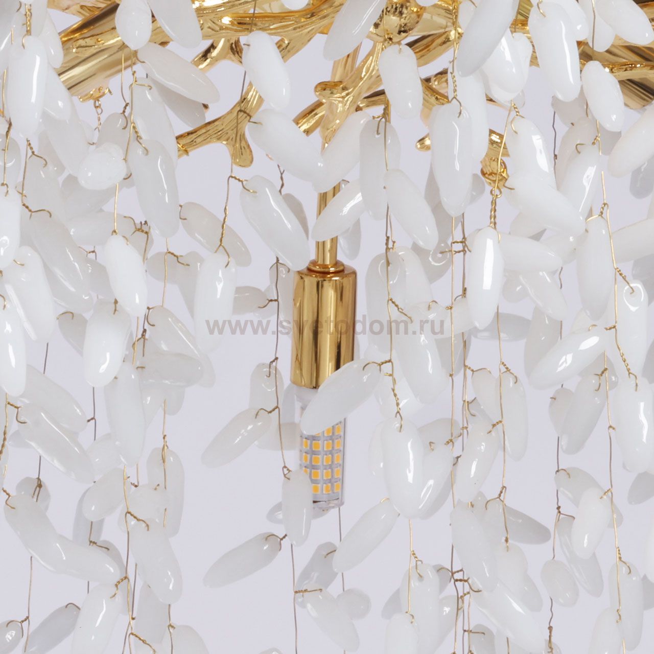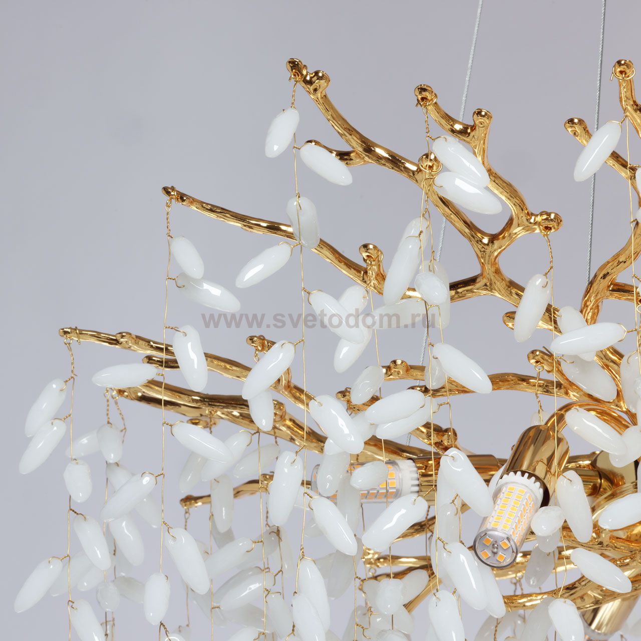 Основание подвесной люстры выполнено по технологии художественного литья из сплава алюминия с цинком и гальванизировано в цвет золота. Потолочная чаша закрыта фактурным художественным литьем. Люстра декорирована гроздьями из белого матового стекла. Комментарий
