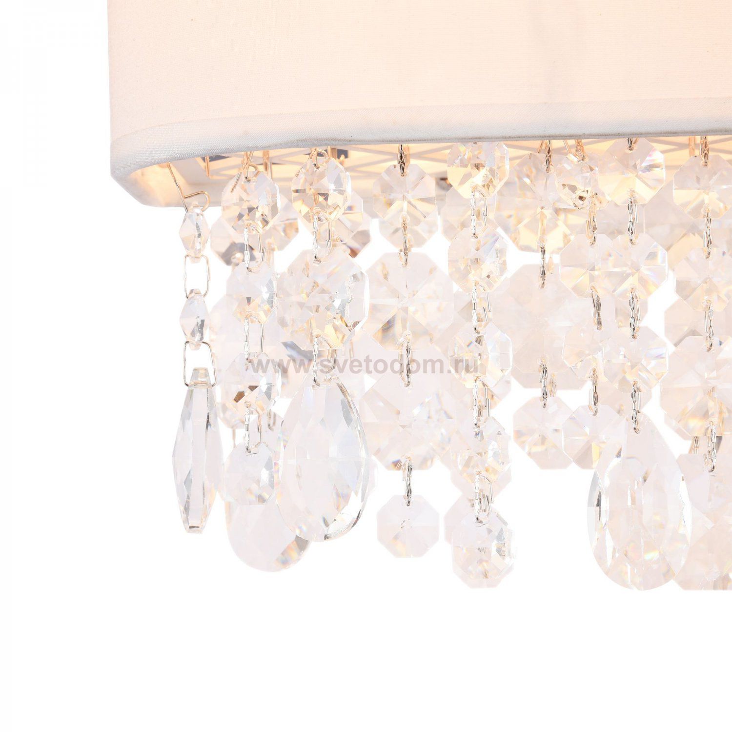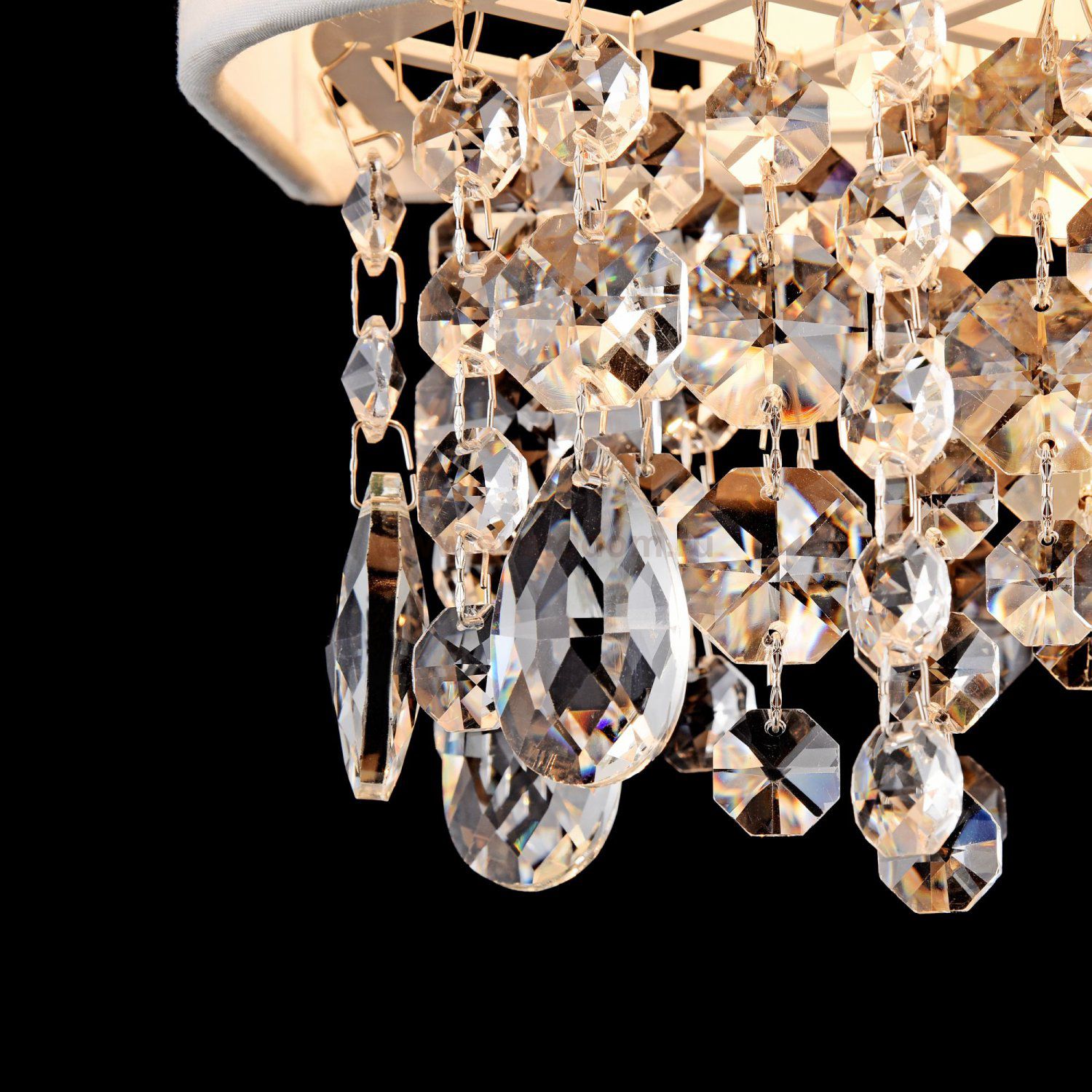 Металлическая арматура в белом цвете. Абажур – ткань, нанесенная на ПВХ, цвет – белый. Декор – подвески в виде граненых кристаллов. Высота подвесных светильников регулируется тросом.