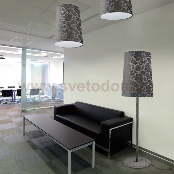 Напольный светильник с абажуром из огнестойкой камчатной ткани, предлагается белого или серого жемчужного цветов. Источники света: лампы накаливания и люминесцентные лампы.