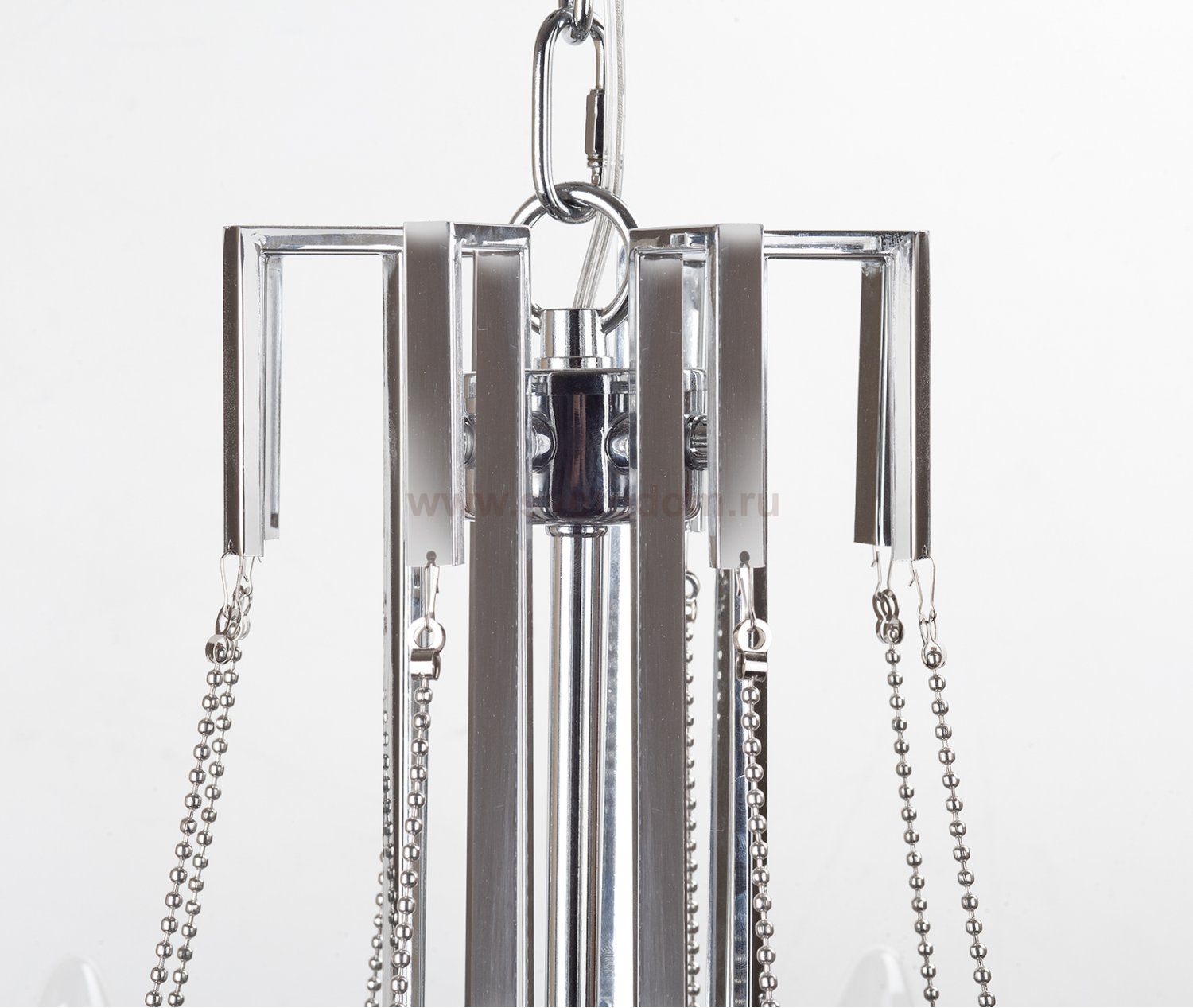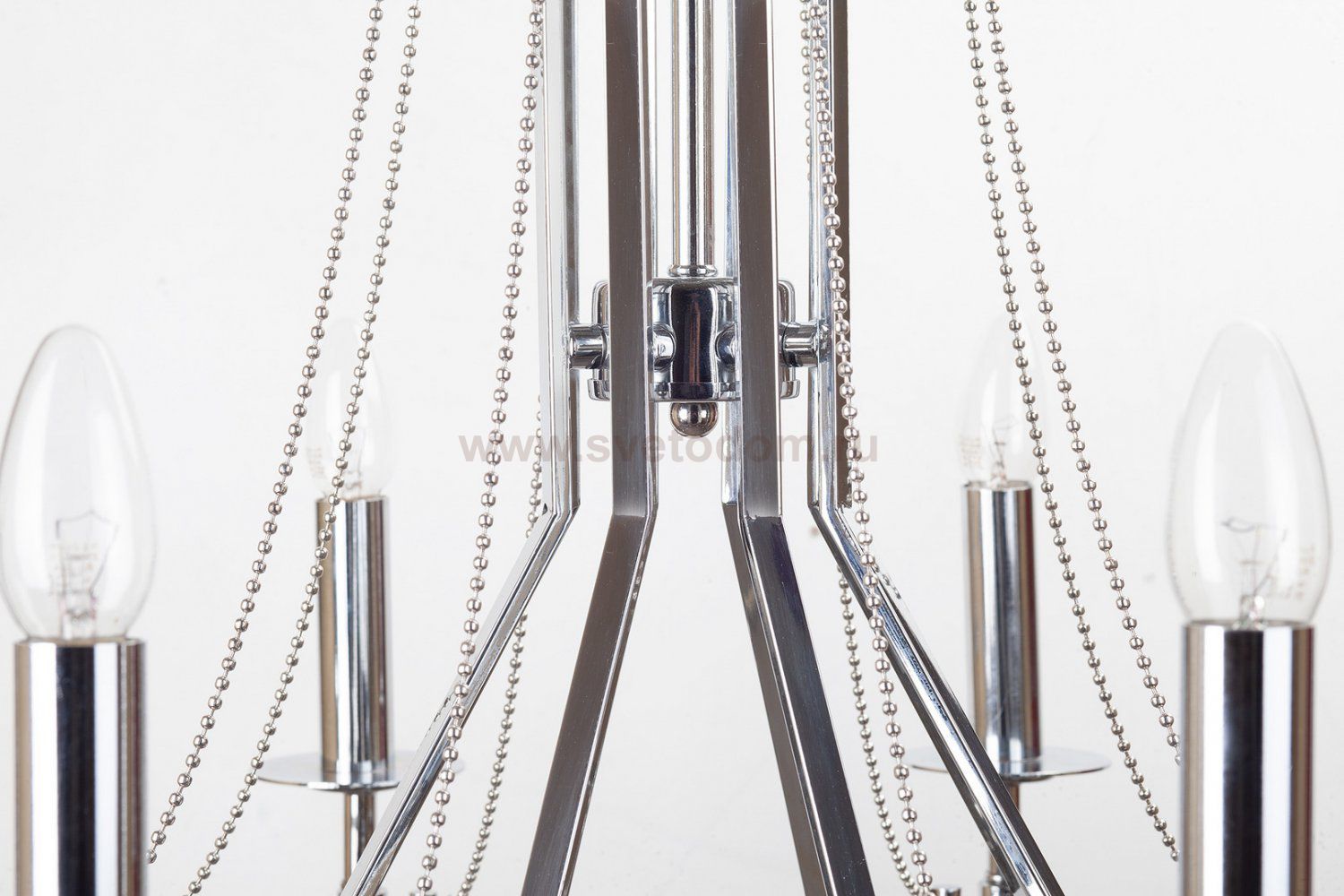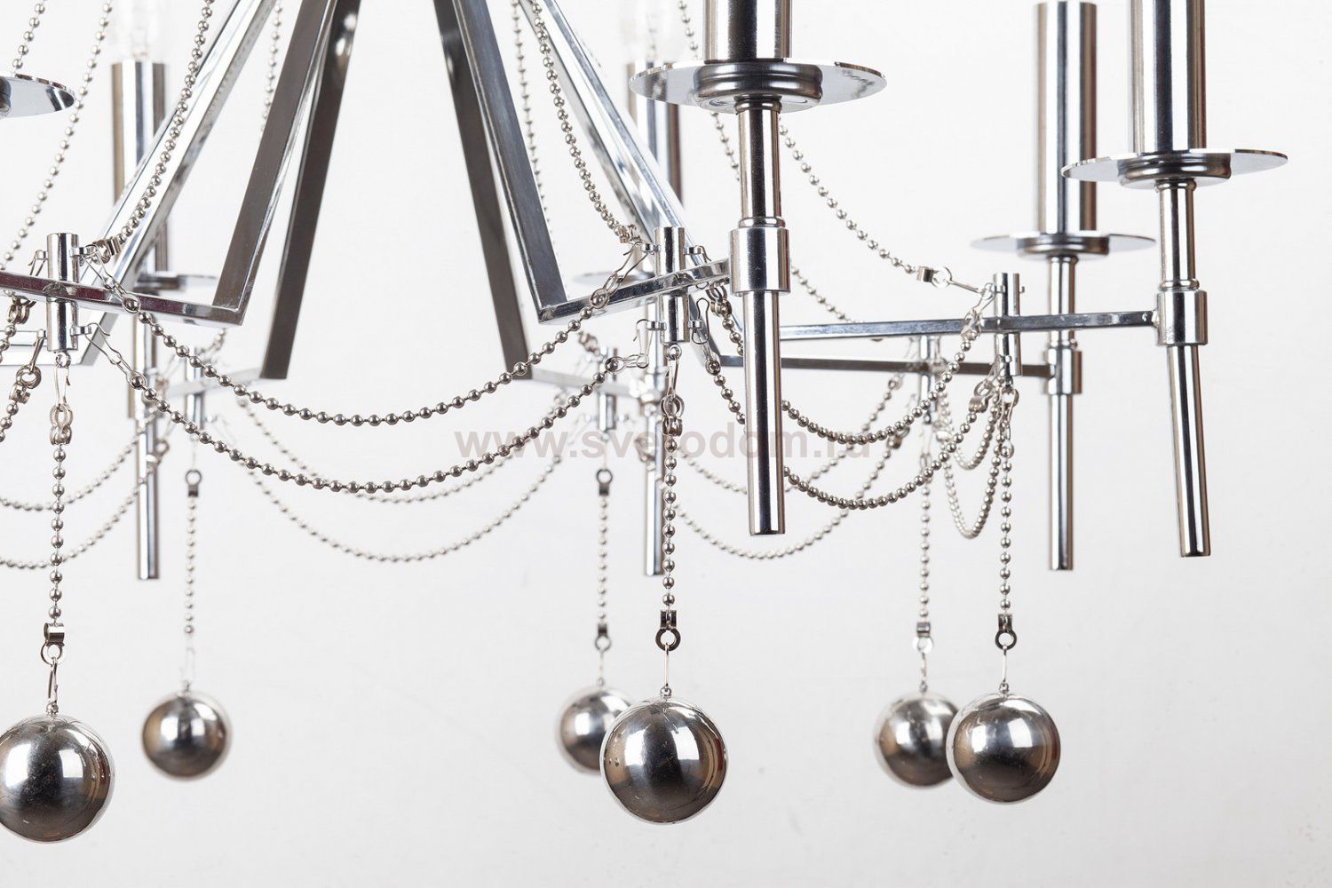 Люстра Rocco Silver 8 сложной конструкции из стилизованного под серебро металла. Состоит из множества изящных элементов разных форм. От верхнего основания модели отходят тонкие стержни с квадратным сечением, которые, дважды изогнувшись под углом 135 градусов, переходят в держатели для ламп. Цоколь в форме свечи оснащен продолговатой лампочкой, имитирующей огонь в зажженном состоянии. В качестве дополнительного декора используются вертикально расположенные трубки, круглые металлические шарики, свисающие с конструкции, и тонкие цепочки, проходящие сверху вниз и охватывающие изделие по бокам.