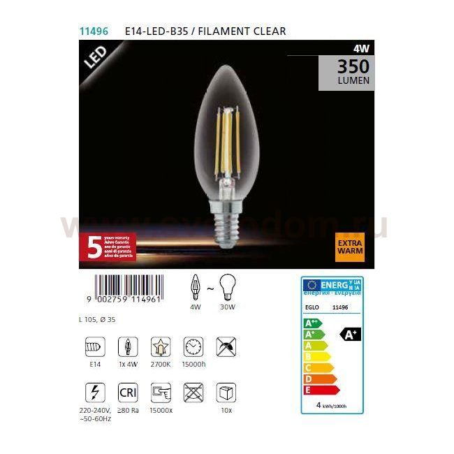 В интернет-магазине «Светодом» можно купить не только люстры и светильники, но и лампочки. В нашем каталоге представлены светодиодные, галогенные, энергосберегающие модели и лампы накаливания. В ассортименте имеются изделия разной мощности, поэтому у нас Вы сможете приобрести все необходимое для освещения. Лампа Eglo 11496 филаментная "Cвеча" обеспечит отличное качество освещения. При покупке ознакомьтесь с параметрами в разделе «Характеристики», чтобы не ошибиться в выборе. Там же указано, для каких осветительных приборов Вы можете использовать лампу Eglo 11496 филаментная "Cвеча"Eglo 11496 филаментная "Cвеча". Для оформления покупки воспользуйтесь «Корзиной». При наличии вопросов Вы можете позвонить нашим менеджерам по одному из контактных номеров. Мы доставляем заказы в Москву, Екатеринбург и другие города России.