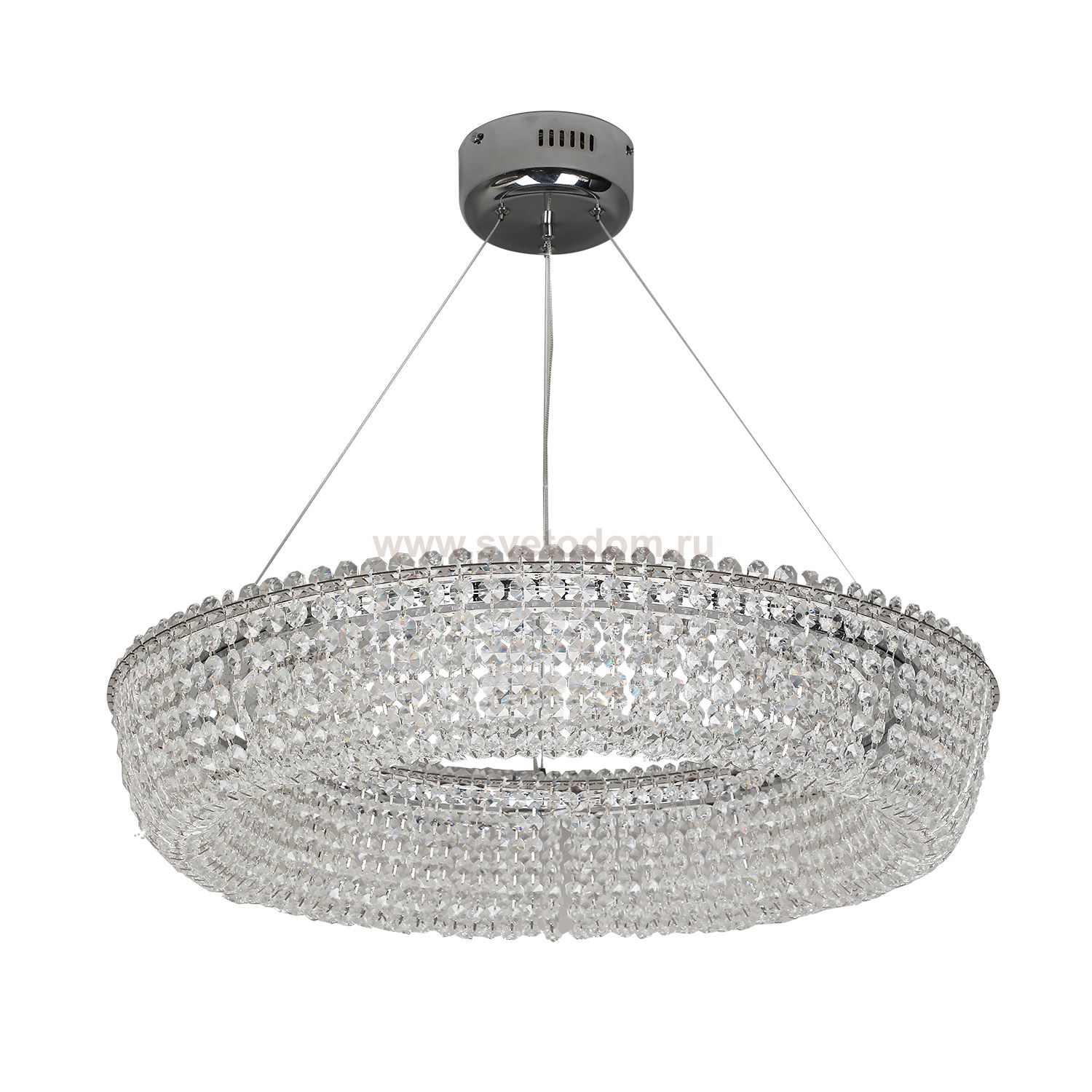 Подвесная кольцевая люстра с каркасом в цвете хром, на кольцо с внешней и внутренней сторон крепятся нити кристаллов, лента со светодиодами, проходяща Серия