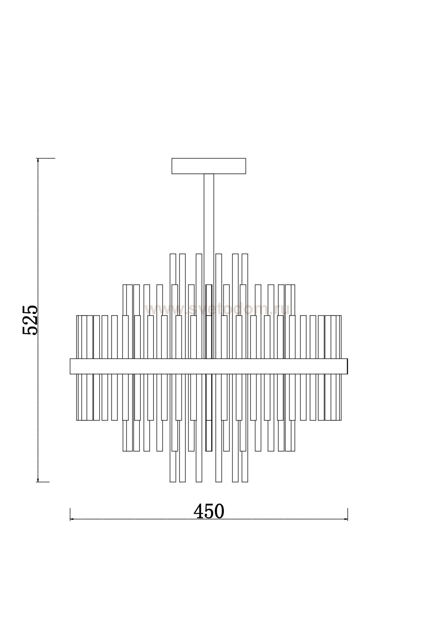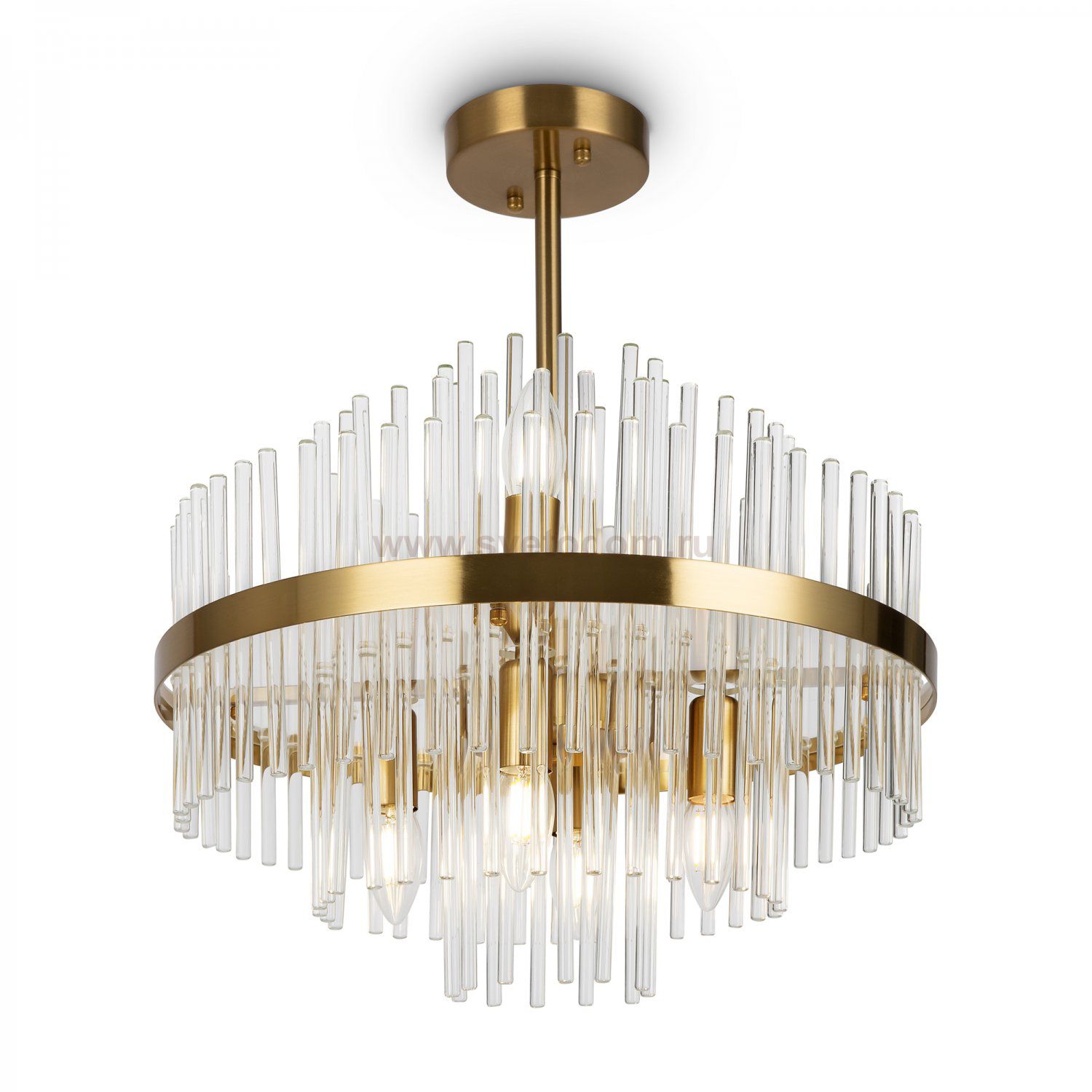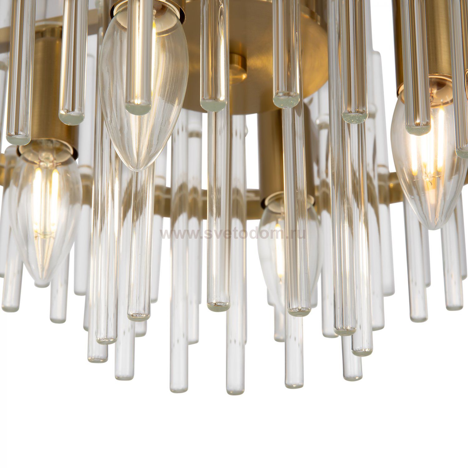 Металлическая арматура, цвет - латунь. Декоративные элементы - прозрачные стеклянные трубки, обрамленные в металлической кольцо в тон арматуре. Источник света - лампа с цоколем Е14.