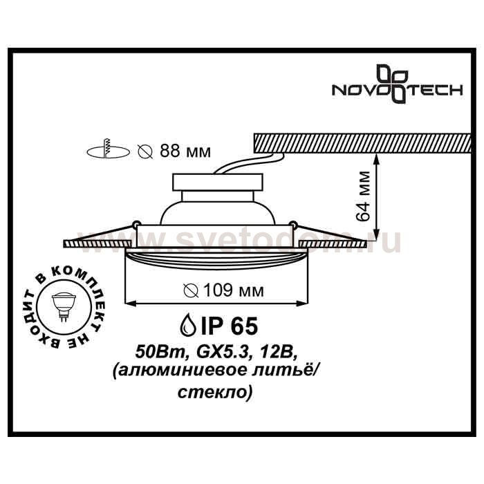 Встраиваемый светильник модели Novotech 369815 из серии AQUA отличается следующим качеством: Влагозащищённый светильник. Корпус светильника – алюминиевое литьё. Это сплав, основными достоинствами которого являются — устойчивость к практически всем видам негативного воздействия окружающей среды, коррозии, небольшой вес, по сравнению с другими видами металла и экологическая безопасность материала. Декоративный плафон произведен из стекла. Стекло экологично, не тускнеет и не меняет своего оттенка со временем, не покрывается некрасивым налетом и легко выдерживает перепады температур.