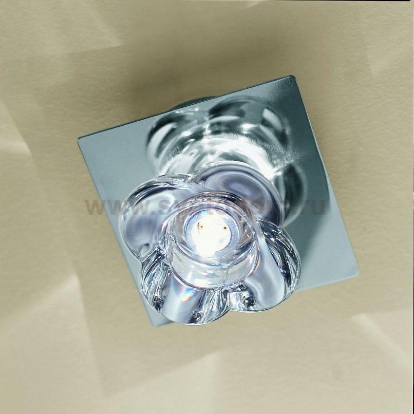 Потолочно-настенный светильник, рассеиватель выполнен из хрусталя, основание светильника сделано из обточенного хромированного металла.