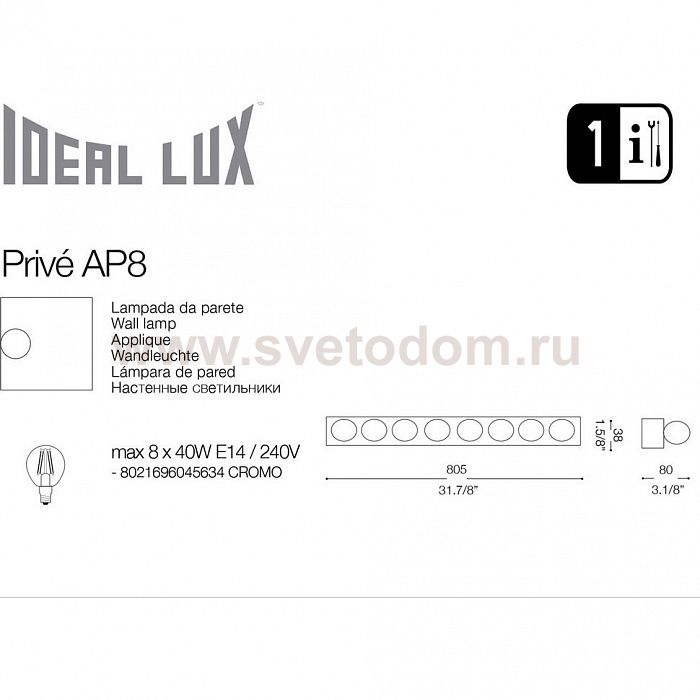 8021696045634 Отзывы Ideal Lux PRIVE' AP8 Настенный светильникПока нет отзывов об этом товаре, напишите и он обязательно появится после модерации! Оставить свой отзывДругие товары магазина Фото