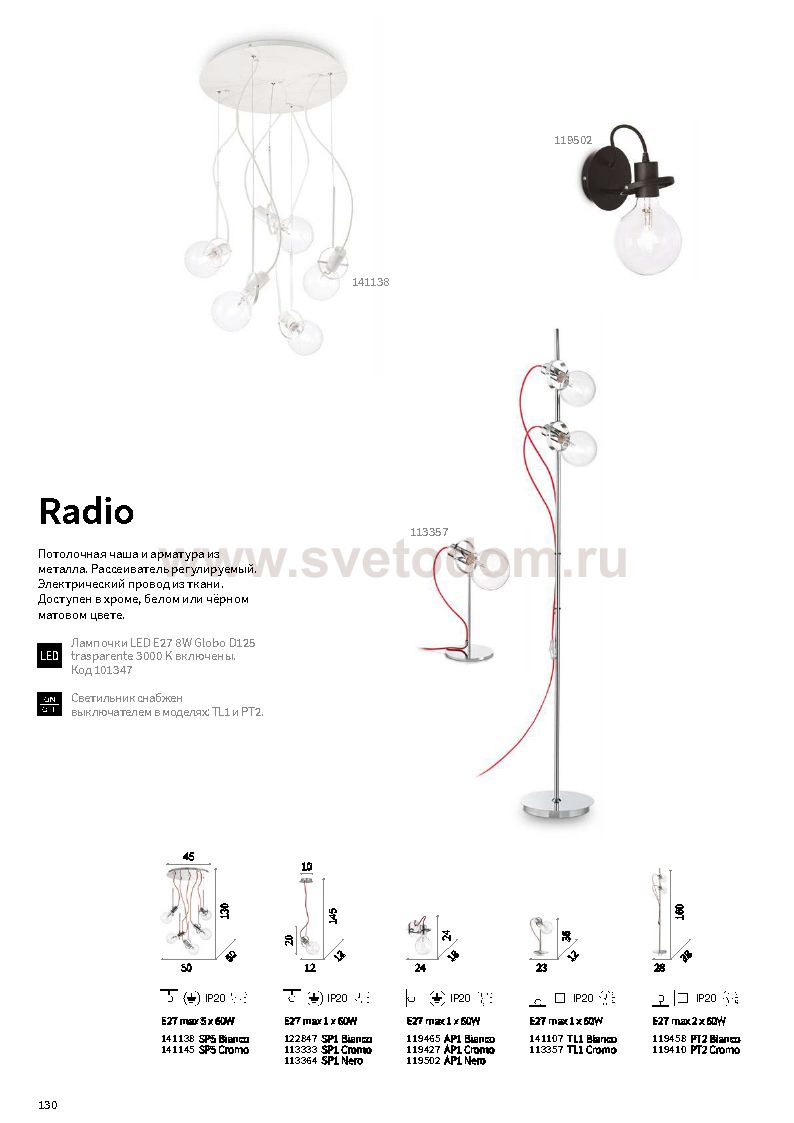 Торшер от известной итальянской фабрики Ideal lux из каталога Moderno в современном стиле под артикулом RADIO PT2 CROMO (119410) серии RADIO имеет ряд отличительных характеристик: Потолочная чаша и арматура из металла. Рассеиватель регулируемый. Электрический провод из ткани. Доступен в хроме, белом или чёрном матовом цвете.