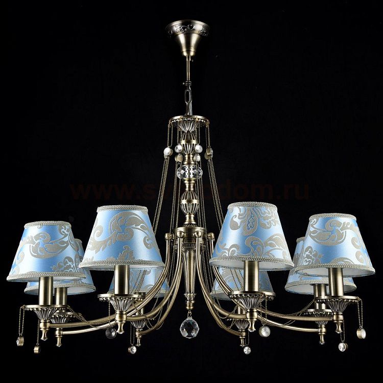 Особенности модели RC098-PL-08-R: Абажуры из голубого хлопка с флокированным орнаментом и тесьмой заметно выделяют светильники серии Vals среди других классических моделей. Каркас изготовлен из металла бронзового цвета. Подвески из кристаллов и цепочки из стальных шариков украшают арматуру, подчеркивая линии силуэта. Высота люстр регулируется длиной цепи.
