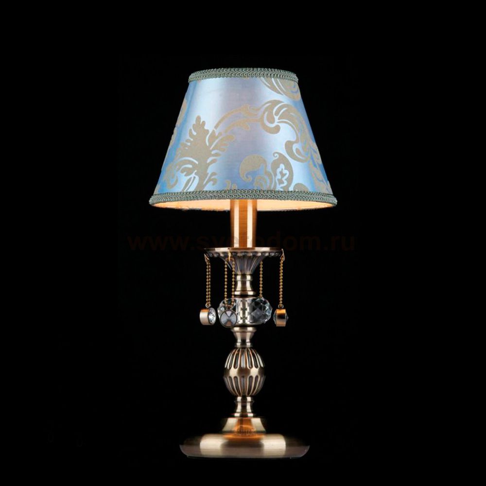 Арматура из металла. Абажур из плотного атласа голубого цвета с принтом. Подвески из *хрусталя. Комментарий